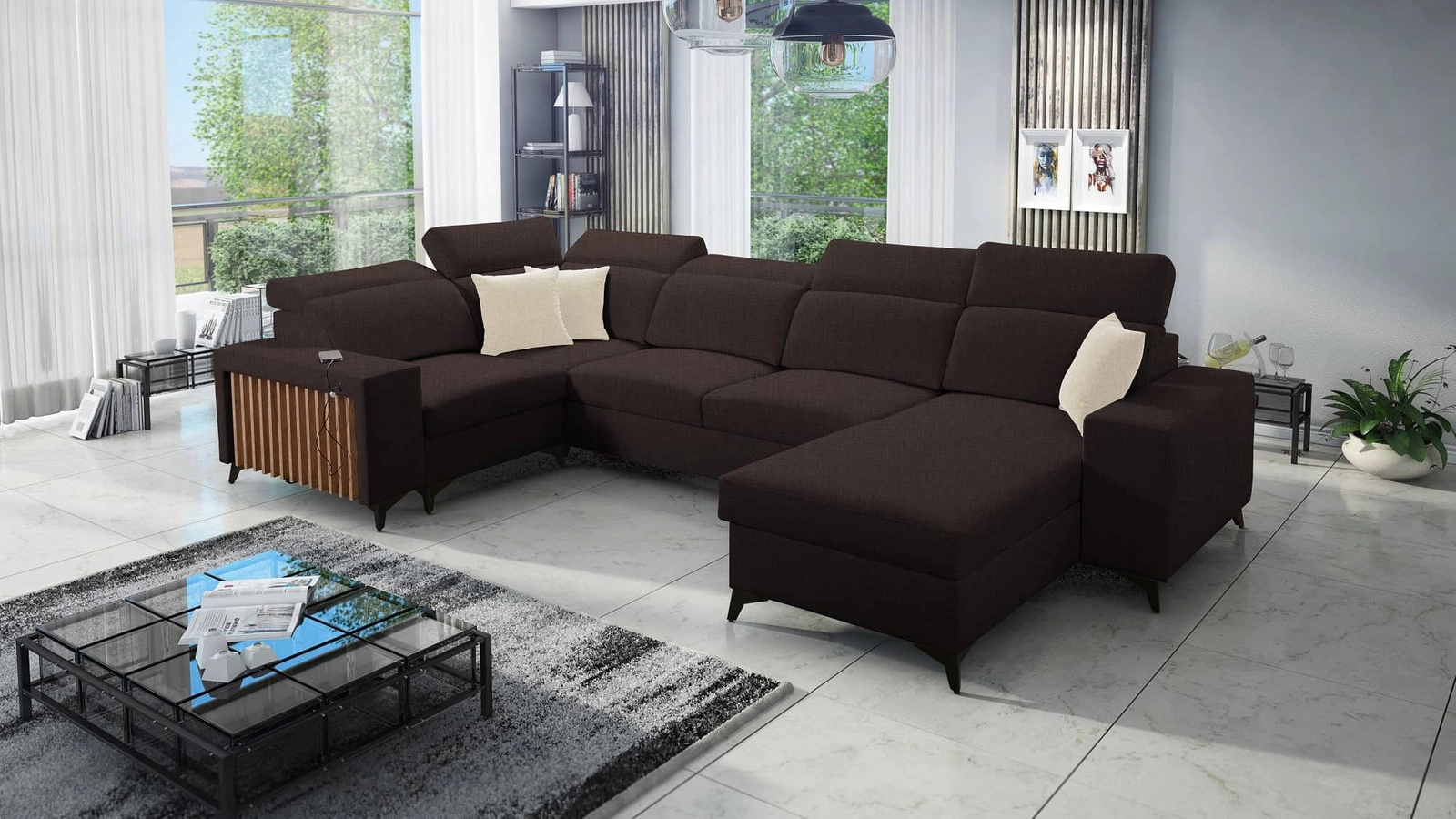 Ecksofa Kelly IV in Braun mit verstellbaren Kopfstützen ist ein interessant aussehendes Möbelstück mit einer Garantie für höchsten Komfort und Funktionalität.