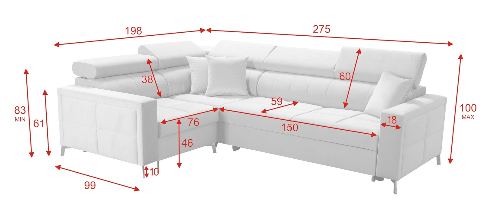 Die Abmessungen der Möbel sind optimal. Breite der Ecke 275 cm, maximale Höhe 100 cm und Tiefe 198 cm. Die Liegefläche der Eckeinheit beträgt 127x210 cm. Die Sitzhöhe des Möbels beträgt 46 cm und die maximale Höhe der Rückenlehne beträgt 60 cm. Gewellte Federn und T30-Polyurethanschaum ist das Material, aus dem der Sitz der Ecke gefertigt ist. Feste Rückenlehne mit verstellbaren Kopfstützen garantiert komfortable Entspannung nach einem langen Tag, die Sie, Ihre Lieben und auch Gäste, die auf diesem einzigartigen Ecksofa sitzen, zu schätzen wissen werden!