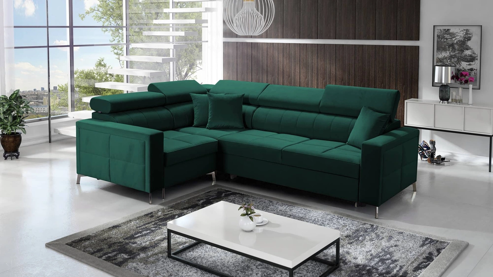Nausa Ecksofa II in Flaschengrün mit verstellbaren Kopfstützen ist ein elegantes Möbelstück, das sich in jede Inneneinrichtung einfügt.
