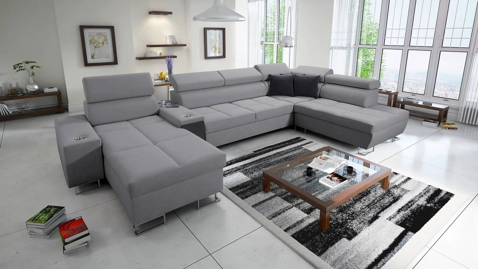 Die Abmessungen der Möbel sind optimal. Breite der Ecke 371 cm, maximale Höhe 100 cm und Tiefe 221 cm. Die Liegefläche der Eckeinheit beträgt 127x195 cm. Die Sitzhöhe des Möbels beträgt 45 cm und die maximale Höhe der Rückenlehne beträgt 60 cm. Gewellte Federn und T30-Polyurethanschaum ist das Material, aus dem der Sitz der Ecke gefertigt ist. Feste Rückenlehne mit verstellbaren Kopfstützen garantiert eine bequeme Entspannung nach einem langen Tag, die von allen, die auf diesem außergewöhnlichen Ecksofa sitzen, geschätzt werden wird! Der Eckschrank ist aus hochwertigen Materialien gefertigt, die gegen äußere Einflüsse wie Möbelbezüge und verschiedene Arten von Stößen resistent sind.