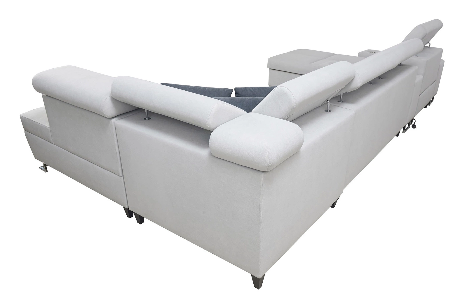 Die Abmessungen der Möbel sind optimal. Breite der Ecke 371 cm, maximale Höhe 100 cm und Tiefe 221 cm. Die Liegefläche der Eckeinheit beträgt 127x195 cm. Die Sitzhöhe des Möbels beträgt 45 cm und die maximale Höhe der Rückenlehne beträgt 60 cm. Gewellte Federn und T30-Polyurethanschaum ist das Material, aus dem der Sitz der Ecke gefertigt ist. Feste Rückenlehne mit verstellbaren Kopfstützen garantiert eine bequeme Entspannung nach einem langen Tag, die von allen, die auf diesem außergewöhnlichen Ecksofa sitzen, geschätzt werden wird! Der Eckschrank ist aus hochwertigen Materialien gefertigt, die resistent gegen äußere Einflüsse wie Möbelbezüge und verschiedene Arten von Stößen sind.