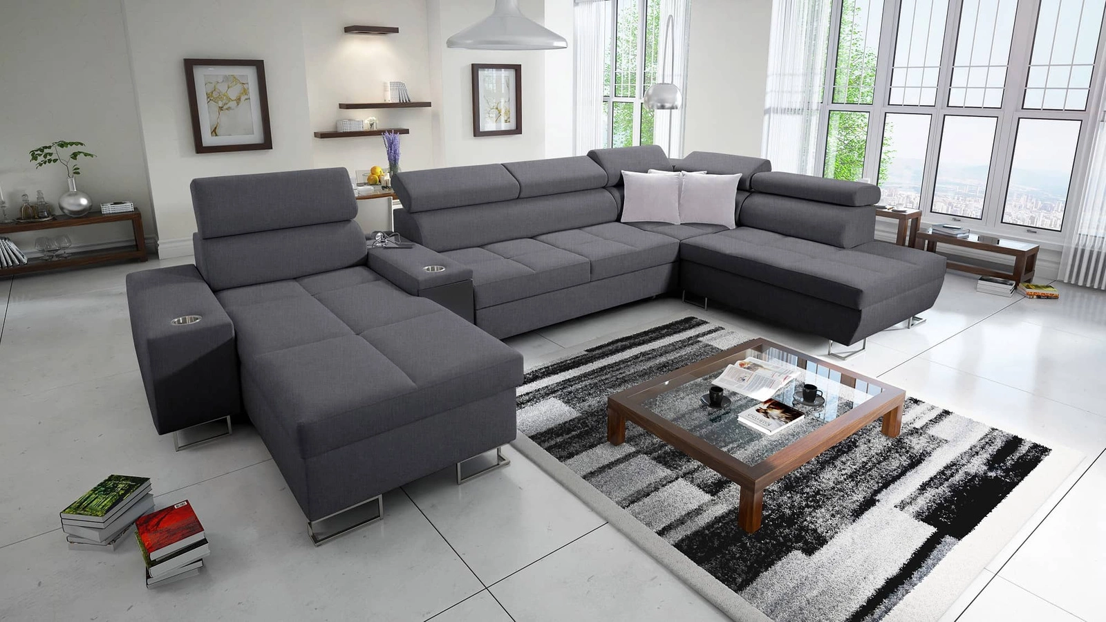 Ecksofa Dafni V in Graphit mit verstellbaren Kopfstützen ist ein interessant aussehendes Möbelstück mit der Garantie für höchsten Komfort und Funktionalität.