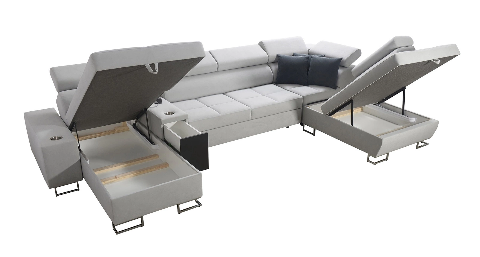 Weitere Merkmale dieses Möbels, die von allen Nutzern geschätzt werden, sind zwei Bettkästen, eine Schlaffunktion, Becherhalter in den Seiten, eine USB-Ladebuchse und eine Steckdose in der Seite des Eckmöbels sowie eine Schublade mit Vollauszug in der Seite des Möbels.