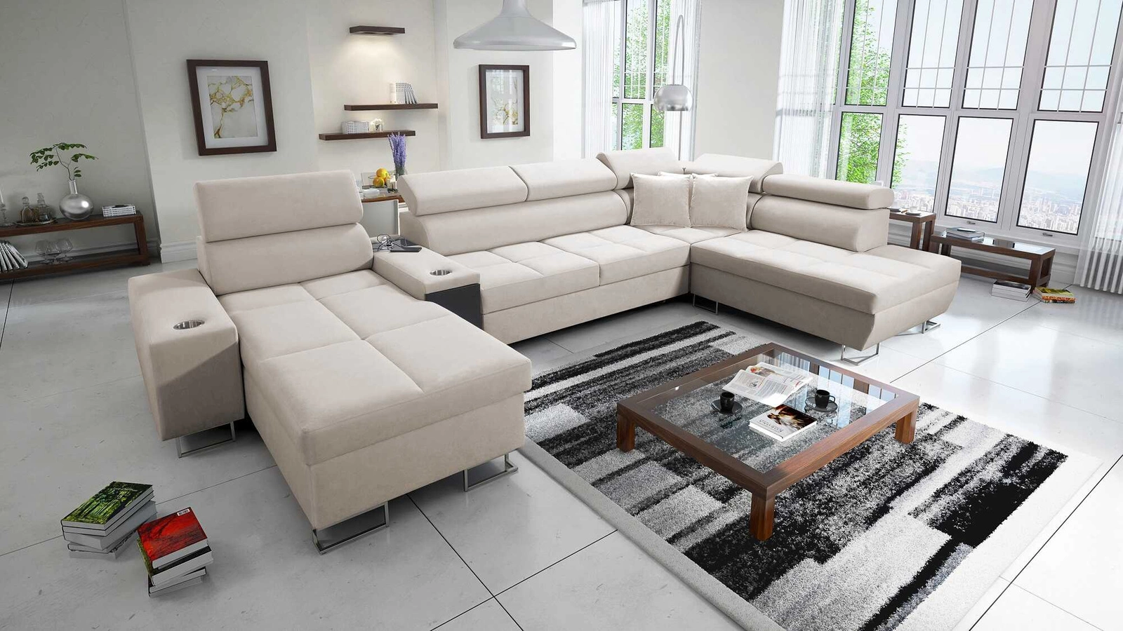 Ecksofa Dafni V in Hellbeige mit verstellbaren Kopfstützen ist ein interessant aussehendes Möbelstück mit der Garantie für höchsten Komfort und Funktionalität.