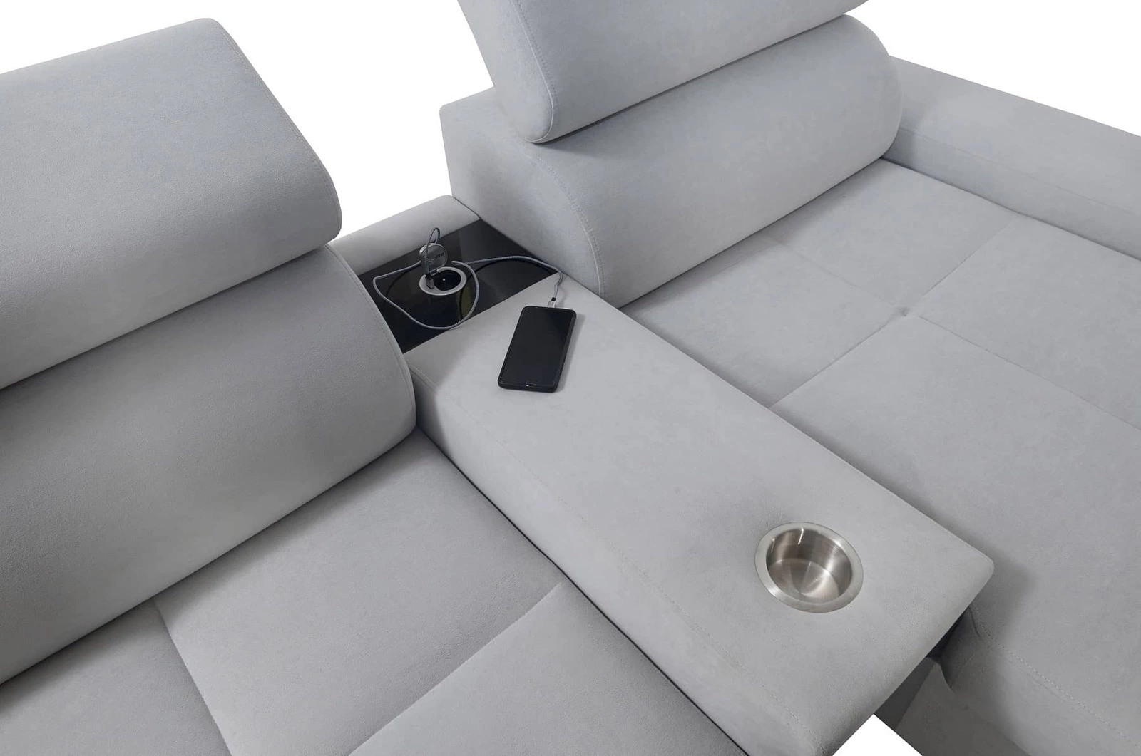 Weitere Merkmale dieses Möbels, die von allen Nutzern geschätzt werden, sind zwei Bettkästen, eine Schlaffunktion, Becherhalter in den Seiten, eine USB-Ladebuchse und eine Steckdose in der Seite des Eckmöbels sowie eine Schublade mit Vollauszug in der Seite des Möbels.