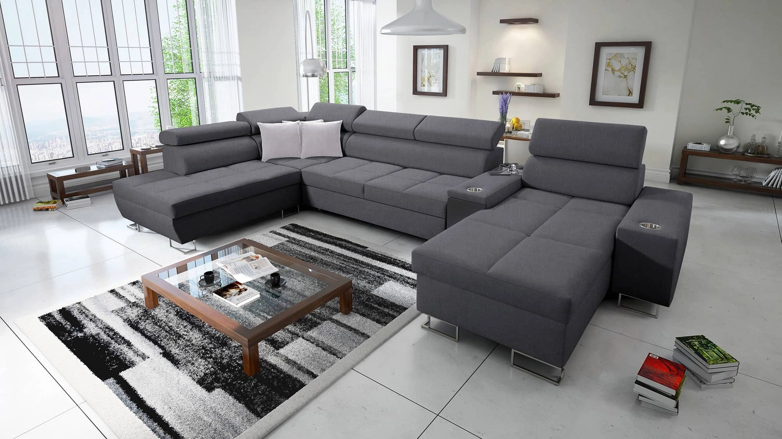Ecksofa Dafni V in Graphit mit verstellbaren Kopfstützen ist ein interessant aussehendes Möbelstück mit der Garantie für höchsten Komfort und Funktionalität.