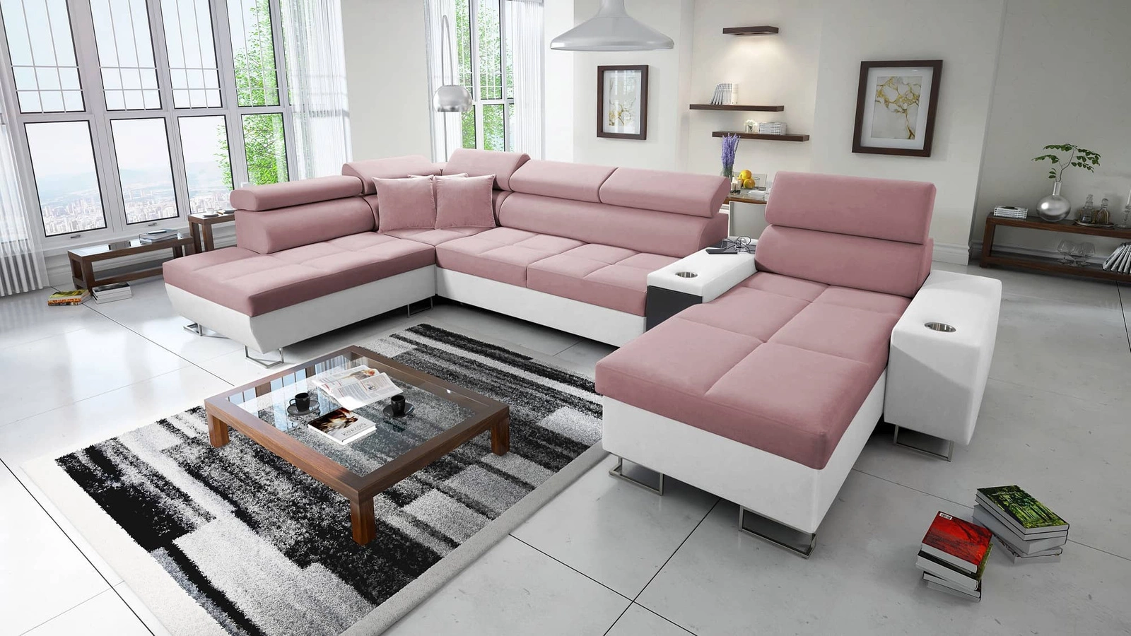 Ecksofa Dafni V in indischem Rosa/Weiß mit verstellbaren Kopfstützen ist ein interessant aussehendes Möbelstück mit einer Garantie für höchsten Komfort und Funktionalität.