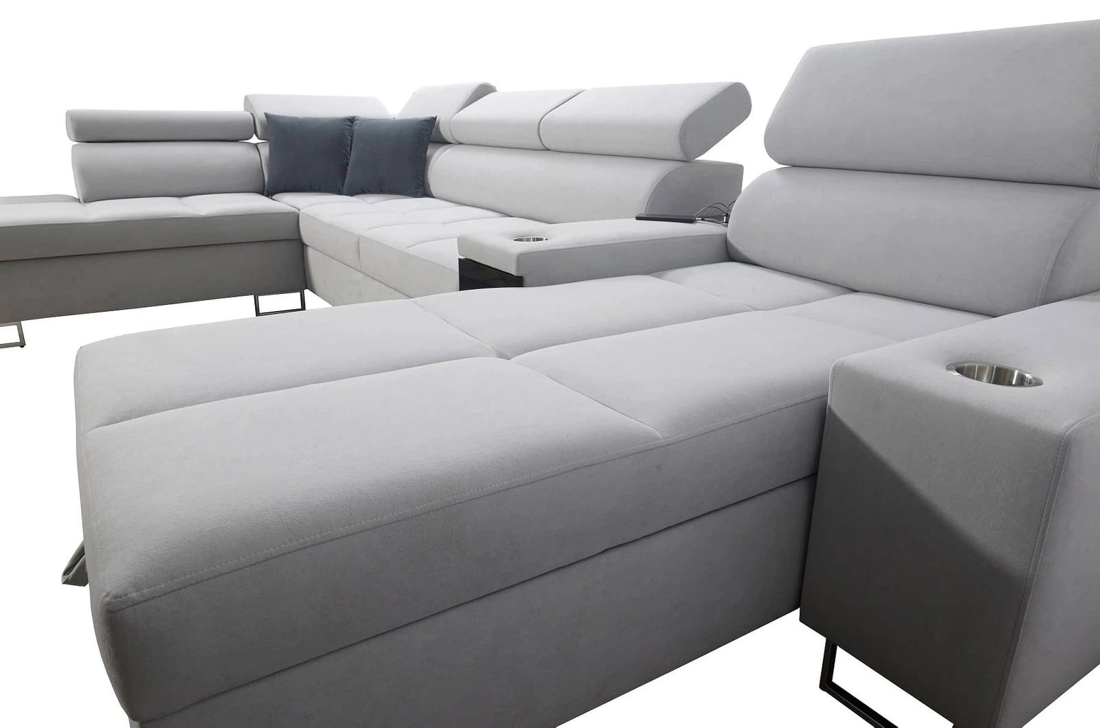 Weitere Merkmale dieses Möbels, die von allen Nutzern geschätzt werden, sind zwei Bettkästen, eine Schlaffunktion, Becherhalter in den Seiten, eine USB-Ladebuchse und eine Steckdose in der Seite des Eckmöbels sowie eine Schublade mit Vollauszug in der Seite des Möbels.