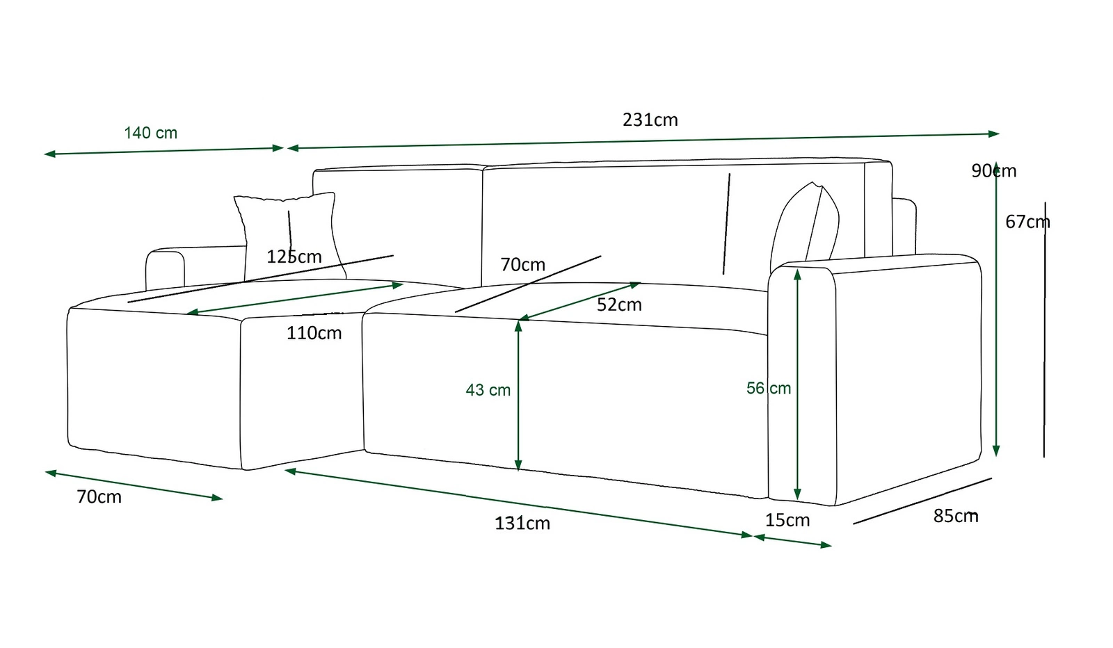 Das Ecksofa mit Schlaffunktion eignet sich dank seiner optimalen Maße und seiner breiten Funktionalität perfekt als Ecksofa für ein Wohnzimmer oder als klappbares Ecksofa für ein Jugendzimmer. Breite der Ecke 231 cm, maximale Höhe 90 cm und Tiefe 140 cm. Die Liegefläche der Eckeinheit beträgt 125x201 cm. Die Sitzhöhe des Möbels beträgt 43 cm, und die Höhe der Rückenlehne beträgt 47 cm. Gewellte Federn und HR30-Schaumstoff ist das Material, aus dem der Sitz der Ecke gefertigt ist. Rückendeckung kissen garantiert komfortable Entspannung nach einem langen Tag, die Sie und Ihre Gäste auf diesem einzigartigen Ecksofa schätzen werden!