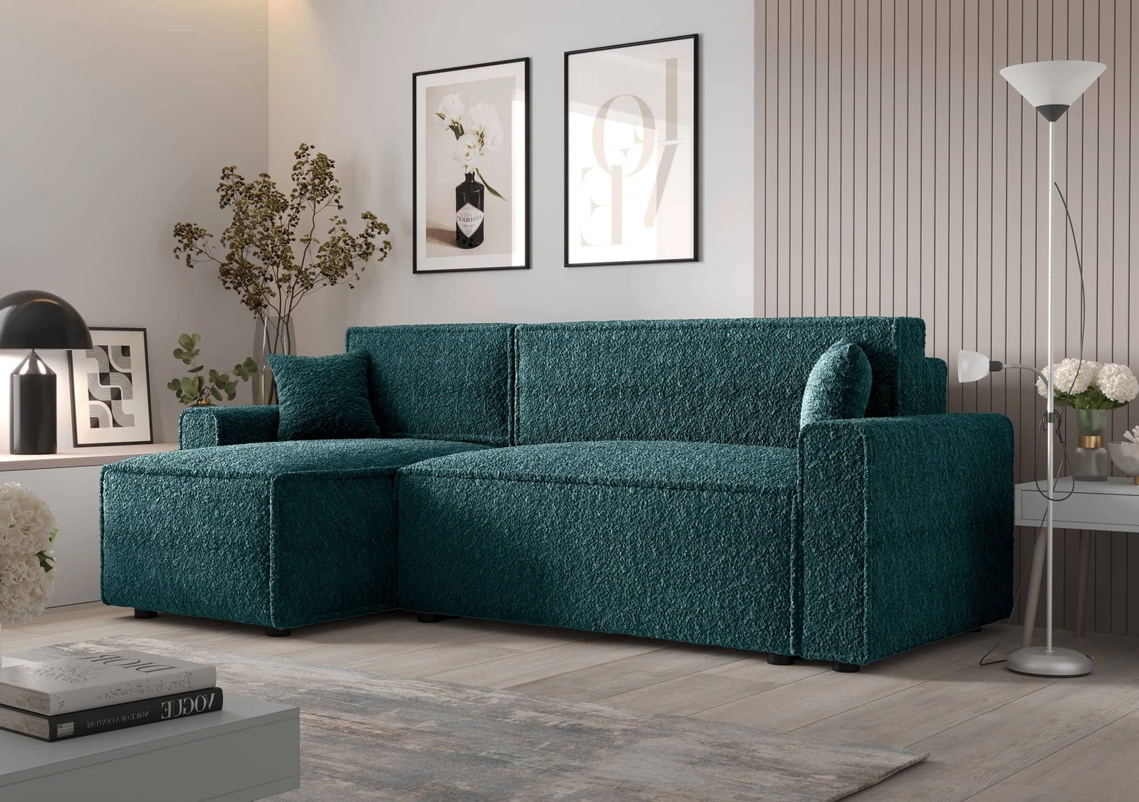 Ecksofa mit Schlaffunktion Brandon Bis türkis linke Seite weicher Stoff mit charakteristischer Schlingenoberfläche Bettzeugbehälter