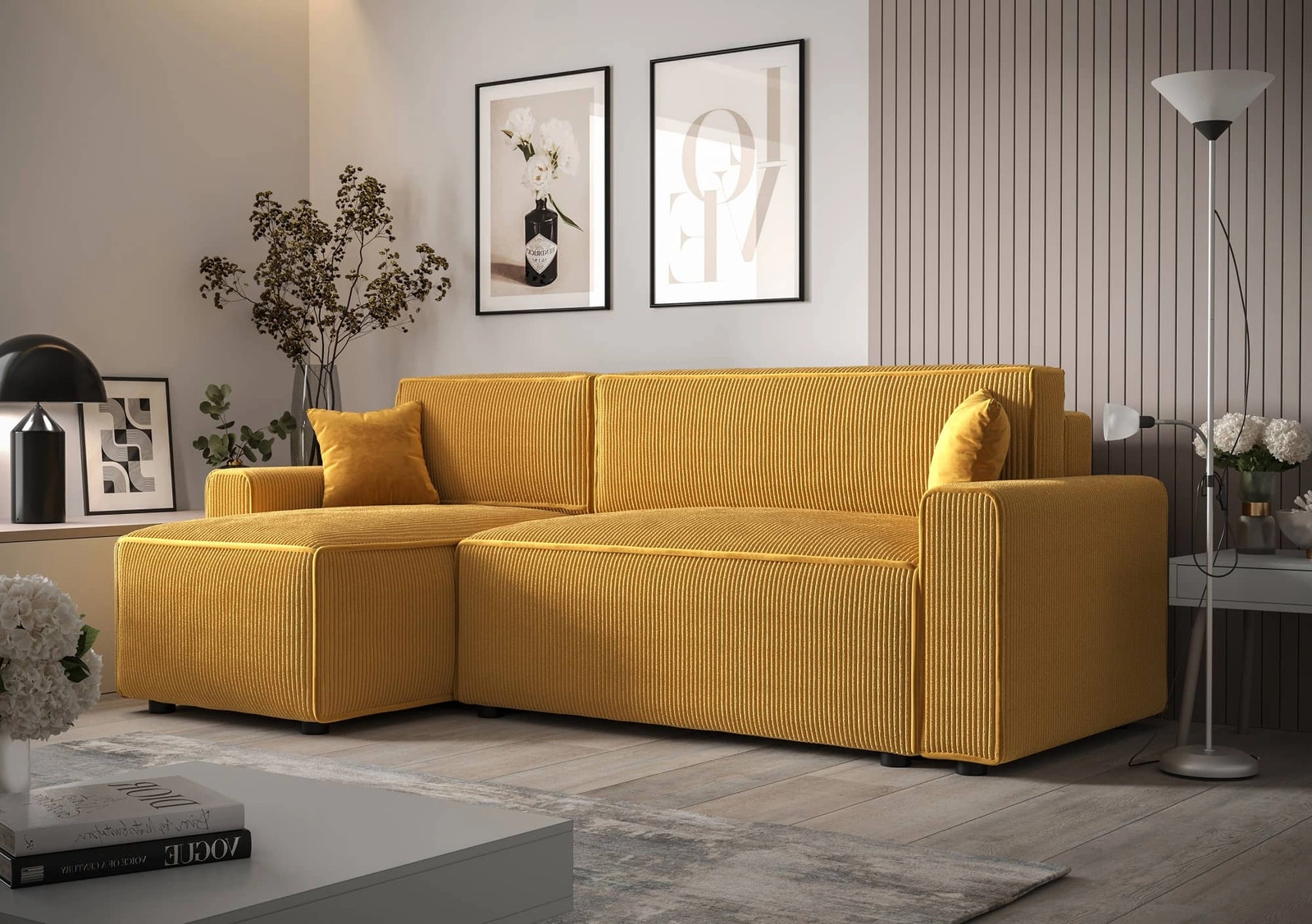 Eckeinheit mit Schlaffunktion Brandon Bis ist ein einfaches Möbelstück mit modernem Design, das sich perfekt in jede Einrichtung einfügt. Das Sofa ist vollständig mit einem Stoff des Typs velours Poso 01. Dreidimensional kordstoff mit seiner ausgeprägten und dicken Rippung verleiht dem Sofa einen besonderen Charakter und macht es einmalig schön. Der Stoff ist sehr weich und dennoch stark und robust. Der Poso-Bezugsstoff ist abriebfest, wie auch leicht sauber zu halten. Dadurch wird das Brandon Bis Klapp-Ecksofa lange Zeit ästhetisch und elegant aussehen. Das Eckmöbel mit täglicher Schlaffunktion ist aus hochwertigen Materialien gefertigt, die resistent gegen äußere Einflüsse wie Möbelbezüge und verschiedene Arten von Stößen sind.