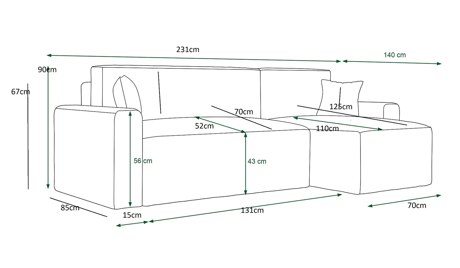 Das Ecksofa mit Schlaffunktion eignet sich dank seiner optimalen Maße und seiner breiten Funktionalität perfekt als Ecksofa für ein Wohnzimmer oder als klappbares Ecksofa für ein Jugendzimmer. Breite der Ecke 231 cm, maximale Höhe 90 cm und Tiefe 140 cm. Die Liegefläche der Eckeinheit beträgt 125x201 cm. Die Sitzhöhe des Möbels beträgt 43 cm, und die Höhe der Rückenlehne beträgt 47 cm. Gewellte Federn und HR30-Schaumstoff ist das Material, aus dem der Sitz der Ecke gefertigt ist. Rückendeckung kissen garantiert komfortable Entspannung nach einem langen Tag, die Sie und Ihre Gäste auf diesem einzigartigen Ecksofa schätzen werden!