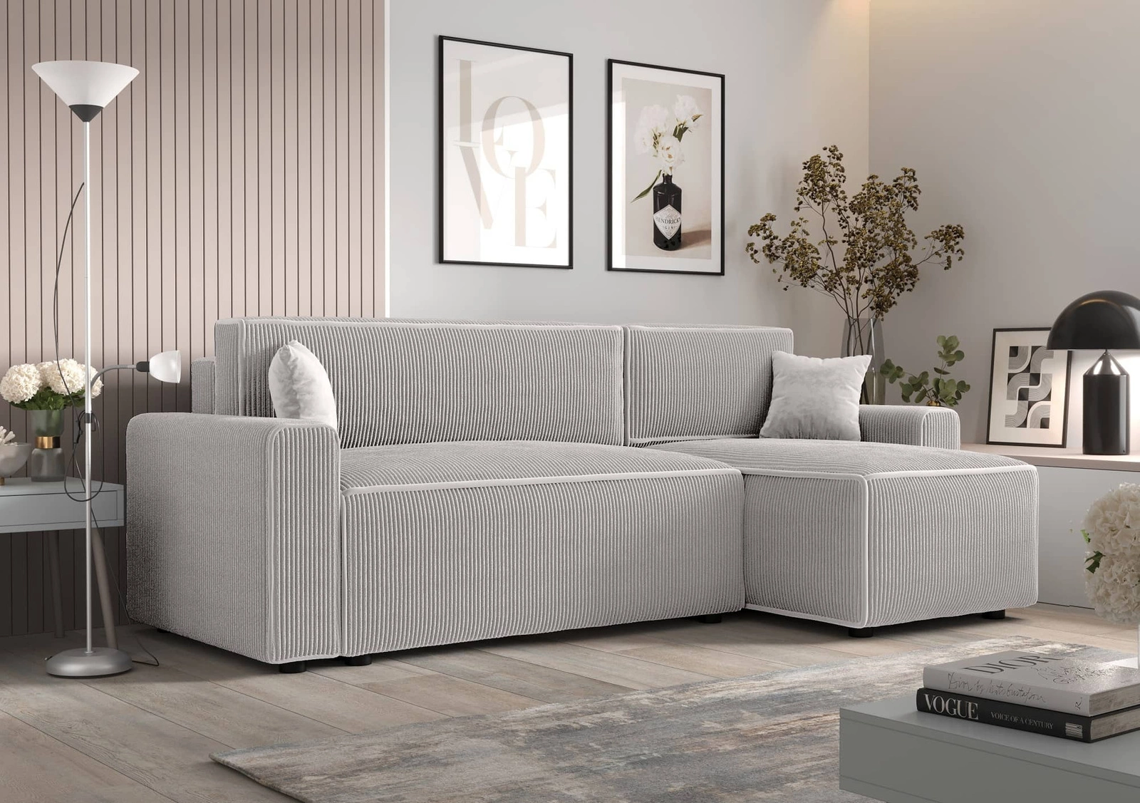 Eckeinheit mit Schlaffunktion Brandon Bis ist ein einfaches Möbelstück mit modernem Design, das sich perfekt in jede Einrichtung einfügt. Das Sofa ist vollständig mit einem Stoff des Typs velours Poso 100. Dreidimensional kordstoff mit seiner ausgeprägten und dicken Rippung verleiht dem Sofa einen besonderen Charakter und macht es einmalig schön. Der Stoff ist sehr weich und dennoch stark und robust. Der Poso-Bezugsstoff ist abriebfest, wie auch leicht sauber zu halten. Dadurch wird das Brandon Bis Klapp-Ecksofa lange Zeit ästhetisch und elegant aussehen. Das Eckmöbel mit täglicher Schlaffunktion ist aus hochwertigen Materialien gefertigt, die resistent gegen äußere Einflüsse wie Möbelbezüge und verschiedene Arten von Stößen sind.