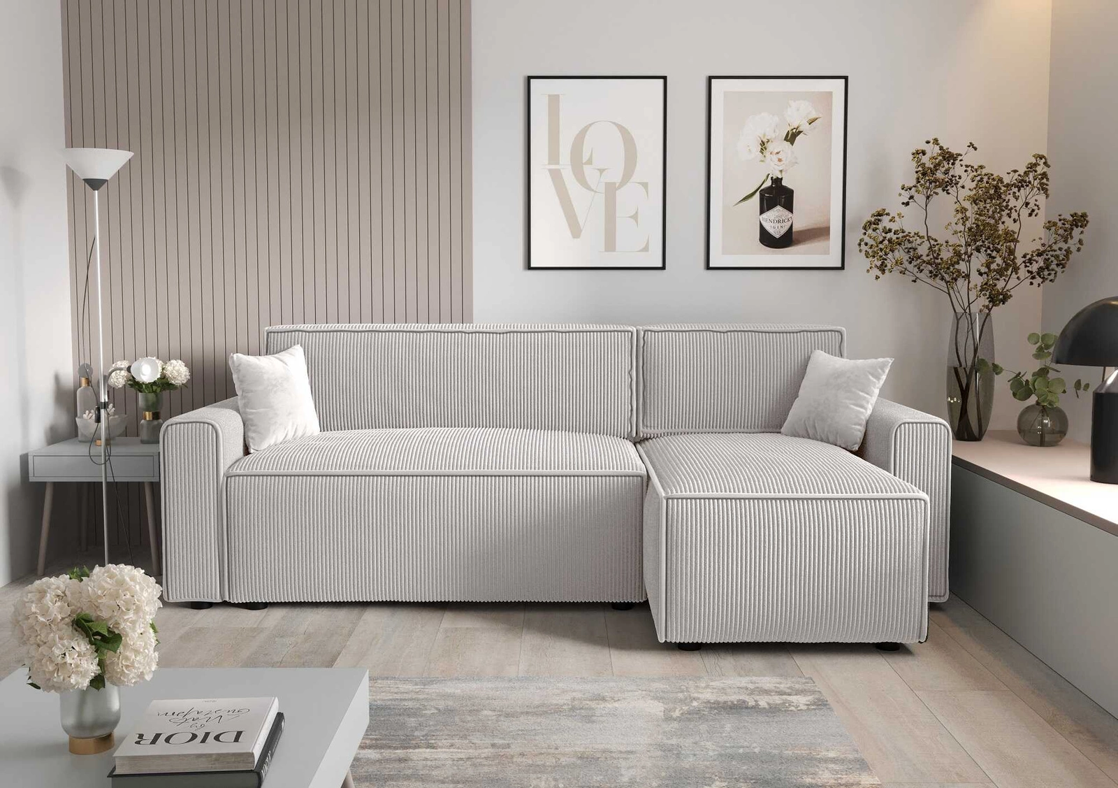 - Das Ecksofa Brandon Bis mit Schlaffunktion ist ein attraktives Möbelstück, das in jedem Raum Ihres Zuhauses seinen Platz finden wird! Ecksofa aus weichem Cordstoff mit ausdrucksstarken und dicken Streifen, die dem Sofa einen besonderen Charakter verleihen
