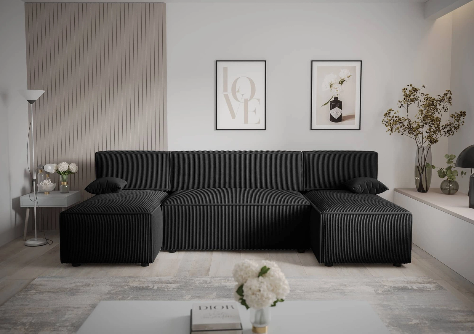 - Das Ecksofa Brandon U mit Schlaffunktion ist ein interessantes Möbelstück, das sich perfekt in die aktuellen Einrichtungstrends einfügt. Ecksofa aus weichem Cordstoff mit ausdrucksstarken und dicken Streifen, die dem Sofa einen besonderen Charakter verlei