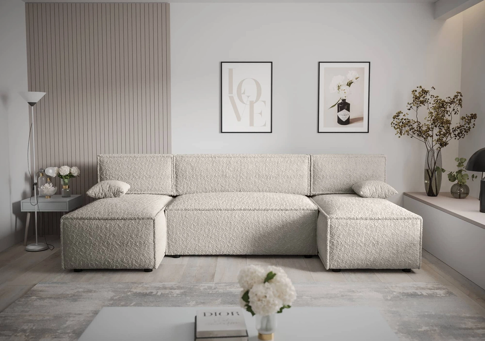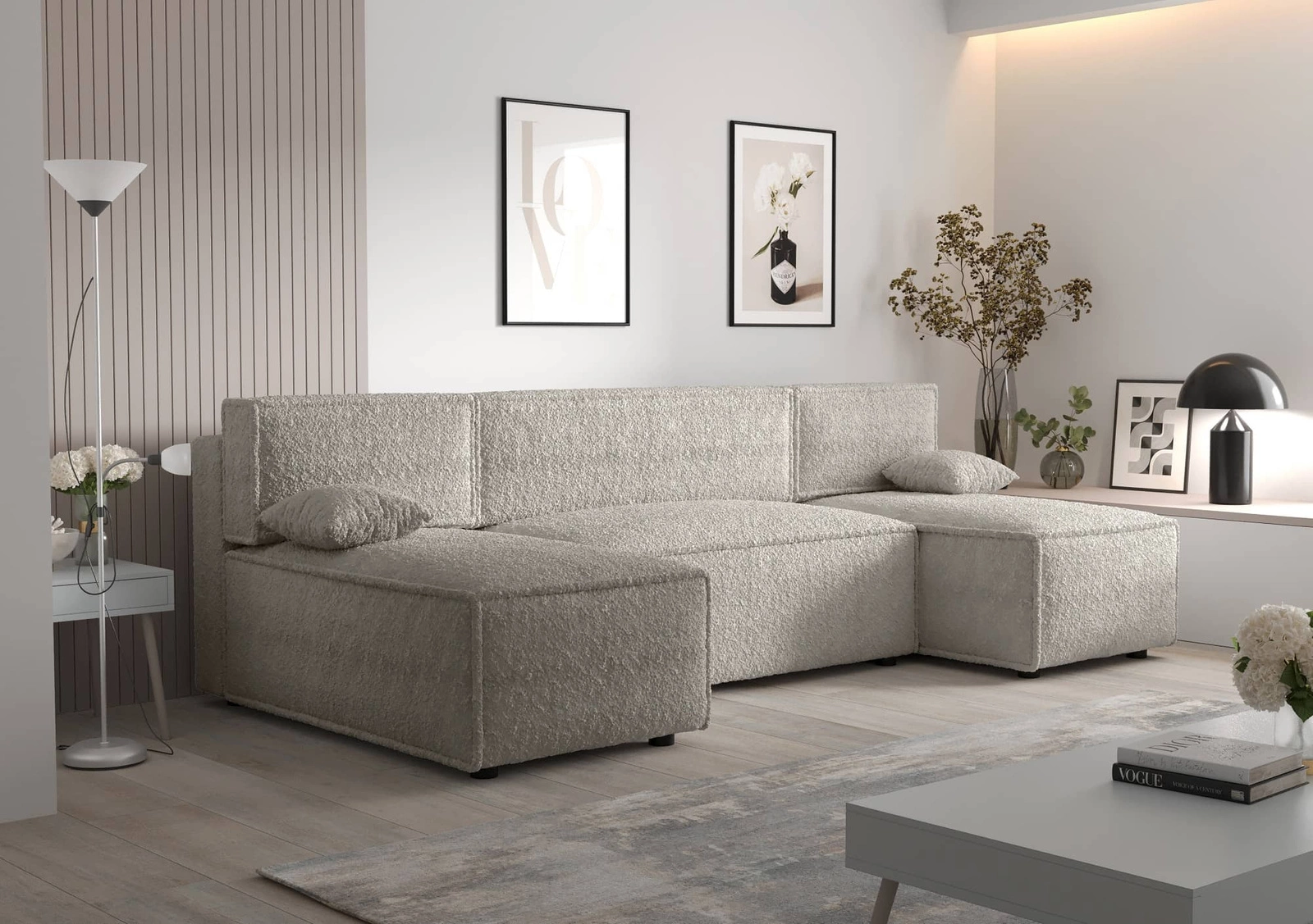 - Das Ecksofa Brandon U mit Schlaffunktion ist ein interessantes Möbelstück, das sich perfekt in die aktuellen Einrichtungstrends einfügt. Das Eckteil ist aus einem angenehm zu berührenden Stoff mit einer markanten Schlingenoberfläche gefertigt, die dem Ele