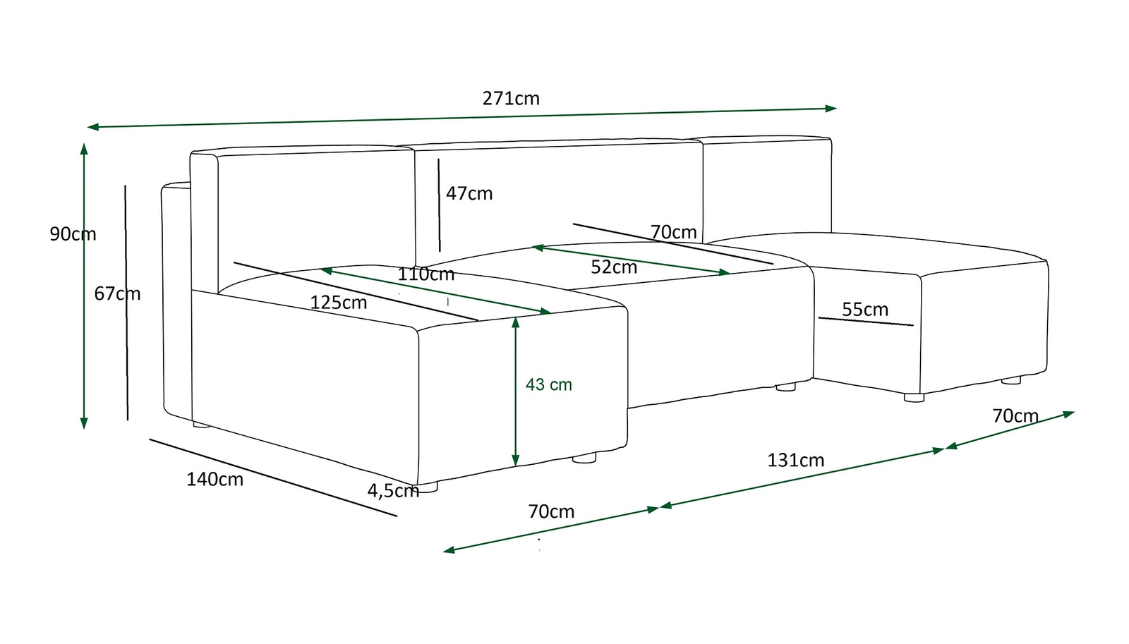 Die Ecke mit Schlaffunktion eignet sich dank ihrer optimalen Abmessungen und ihrer breiten Funktionalität perfekt als Ecke für das Wohnzimmer oder als Klappecke für ein Jugendzimmer. Breite der Ecke 271 cm, maximale Höhe 90 cm und Tiefe 140 cm. Die Liegefläche der Eckeinheit beträgt 125x271 cm. Die Sitzhöhe des Möbels beträgt 43 cm, und die Höhe der Rückenlehne beträgt 47 cm. Gewellte Federn und HR30-Schaumstoff ist das Material, aus dem der Sitz der Ecke gefertigt ist. Rückendeckung kissen garantiert komfortable Entspannung nach einem langen Tag, die Sie und Ihre Gäste auf diesem einzigartigen Ecksofa schätzen werden!