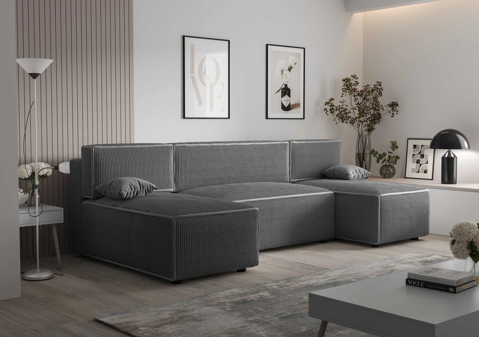 - Das Ecksofa Brandon U mit Schlaffunktion ist ein interessantes Möbelstück, das sich perfekt in die aktuellen Einrichtungstrends einfügt. Ecksofa aus weichem Cordstoff mit ausdrucksstarken und dicken Streifen, die dem Sofa einen besonderen Charakter verlei