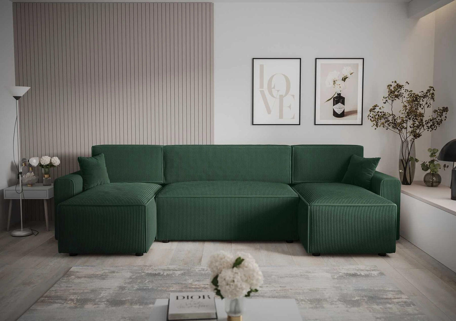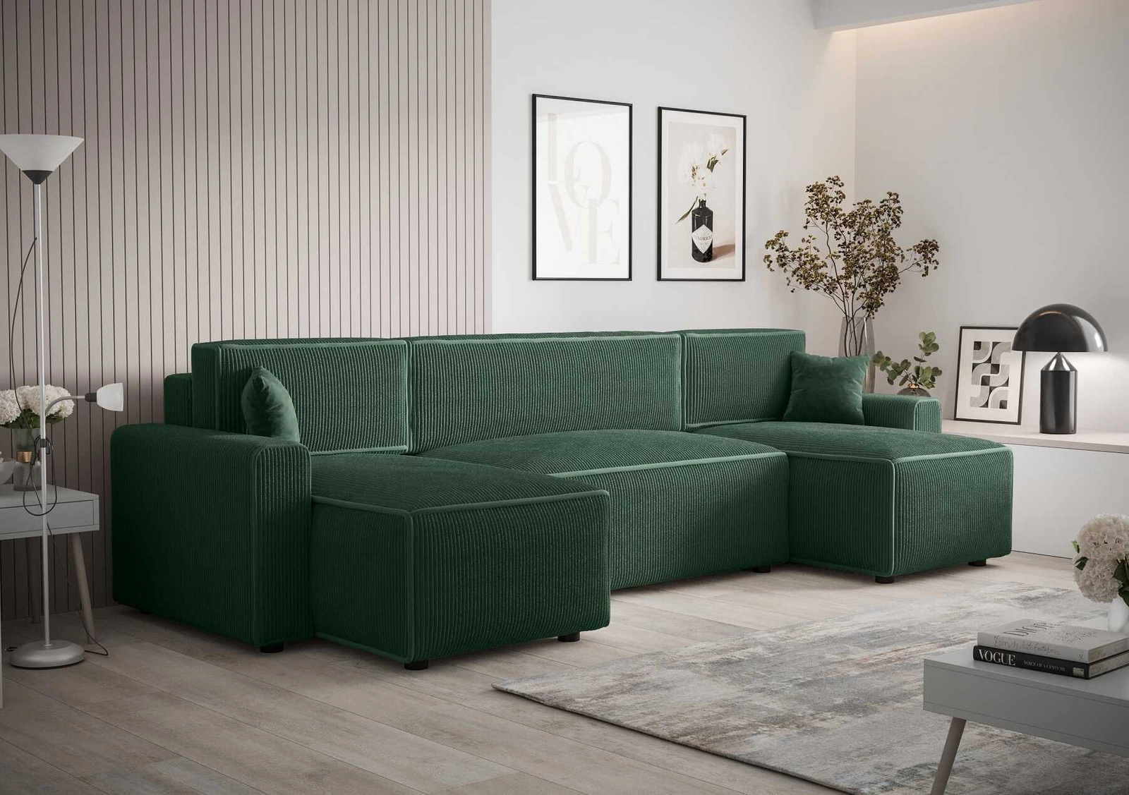 Eckeinheit mit Schlaffunktion Brandon U Bis ist ein einfaches Möbelstück mit modernem Design, das sich perfekt in jede Einrichtung einfügt. Das Sofa war vollständig mit einem Stoff der Art velours Poso 14. Dreidimensional kordstoff mit seiner ausgeprägten und dicken Rippung verleiht dem Sofa einen besonderen Charakter und macht es einmalig schön. Der Stoff ist sehr weich und dennoch stark und robust. Der Poso-Bezugsstoff ist abriebfest, wie auch leicht sauber zu halten. Dank dieser Eigenschaft wird das Brandon U Bis Ecksofa lange Zeit ästhetisch und elegant aussehen. Das Eckmöbel mit täglicher Schlaffunktion ist aus hochwertigen Materialien gefertigt, die resistent gegen äußere Einflüsse wie Möbelbezüge und verschiedene Arten von Stößen sind.