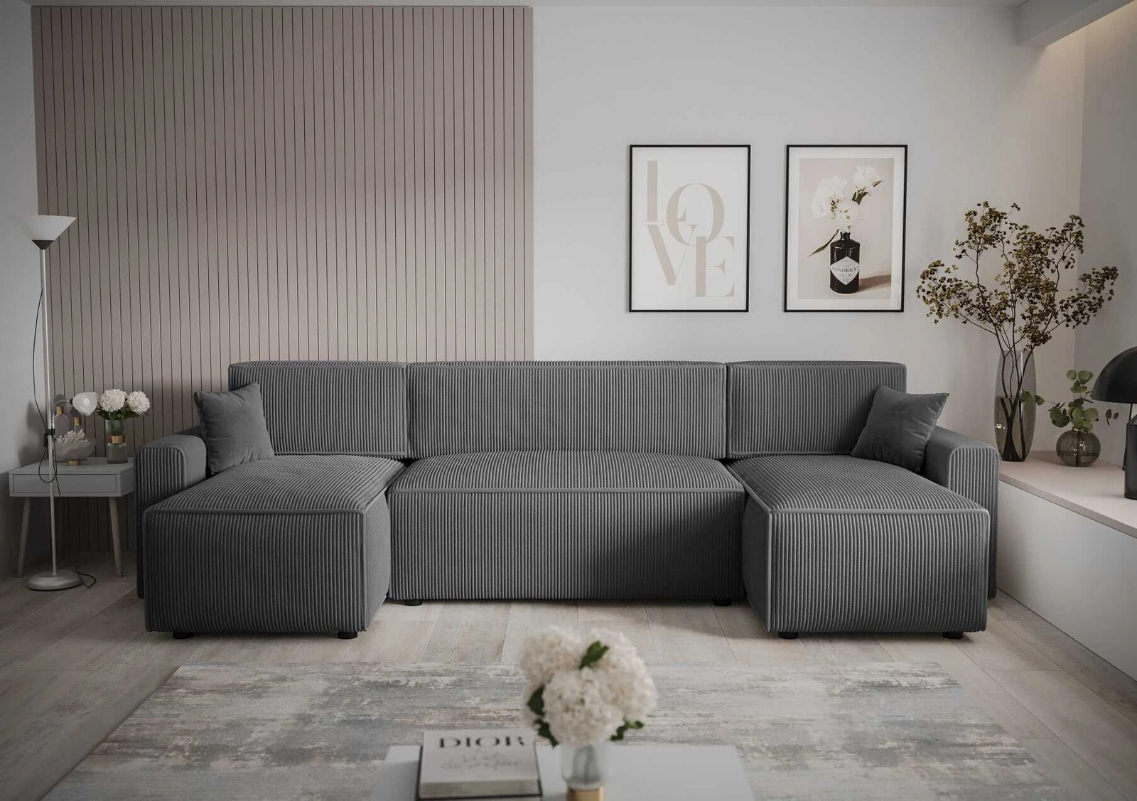 Eckeinheit mit Schlaffunktion Brandon U Bis ist ein einfaches Möbelstück mit modernem Design, das sich perfekt in jede Einrichtung einfügt. Das Sofa war vollständig mit einem Stoff der Art velours Poso 60. Dreidimensional kordstoff mit seiner ausgeprägten und dicken Rippung verleiht dem Sofa einen besonderen Charakter und macht es einmalig schön. Der Stoff ist sehr weich und dennoch stark und robust. Der Poso-Bezugsstoff ist abriebfest, wie auch leicht sauber zu halten. Dank dieser Eigenschaft wird das Brandon U Bis Ecksofa lange Zeit ästhetisch und elegant aussehen. Das Eckmöbel mit täglicher Schlaffunktion ist aus hochwertigen Materialien gefertigt, die resistent gegen äußere Einflüsse wie Möbelbezüge und verschiedene Arten von Stößen sind.