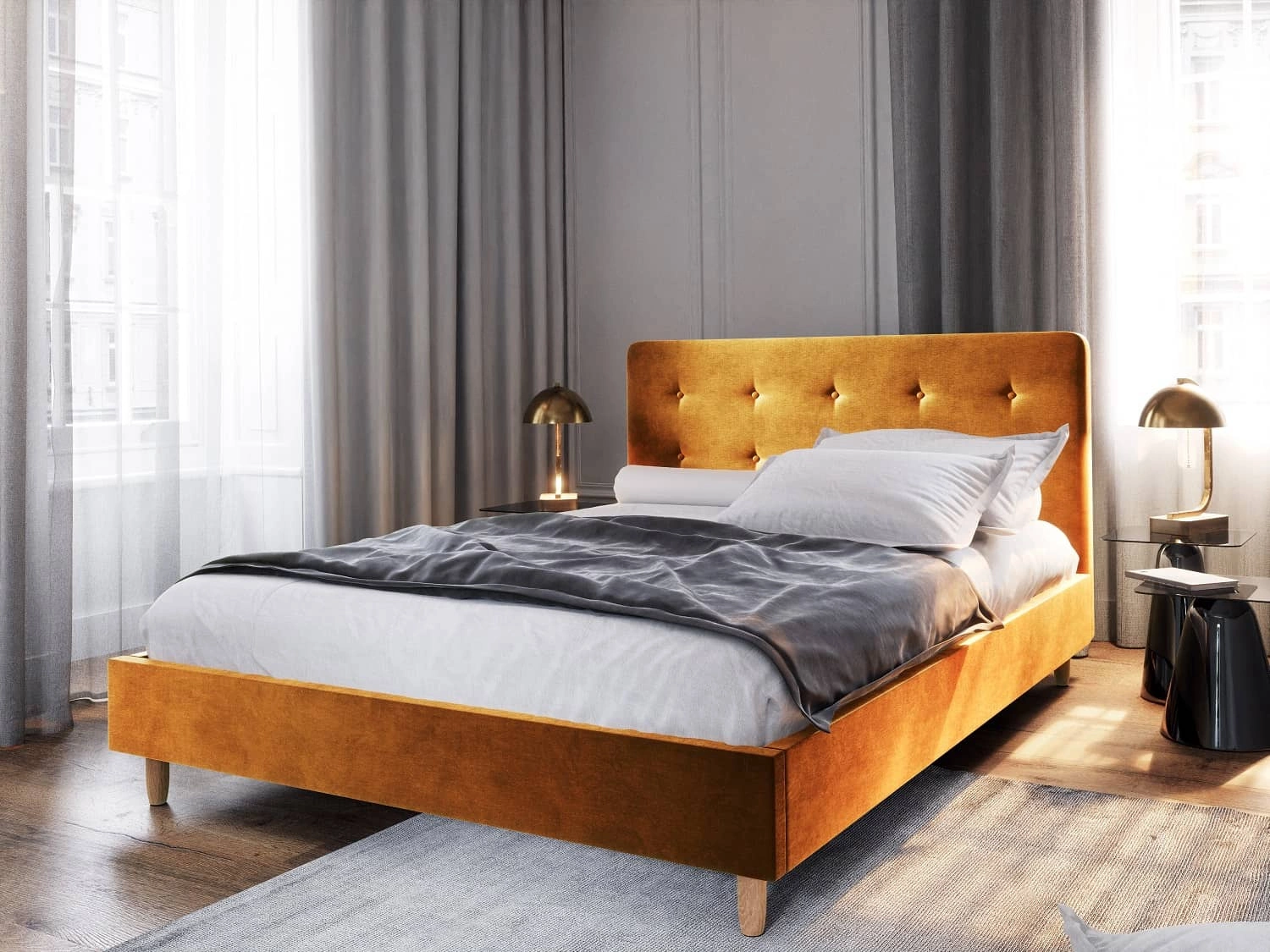 Das Polsterbett Noiro 160x200 in senf ist ein stilvolles Möbelstück, das perfekt in jedes Schlafzimmer passt.