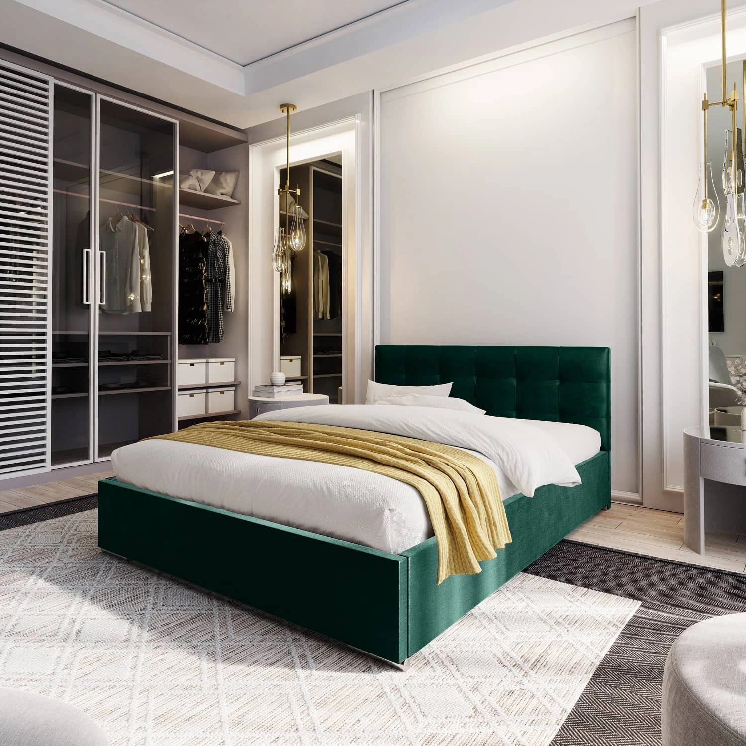 Polsterbett Montigo 180x200 flaschengrün mit Container im modernen skandinavischen Stil mit gestepptem Kopfteil