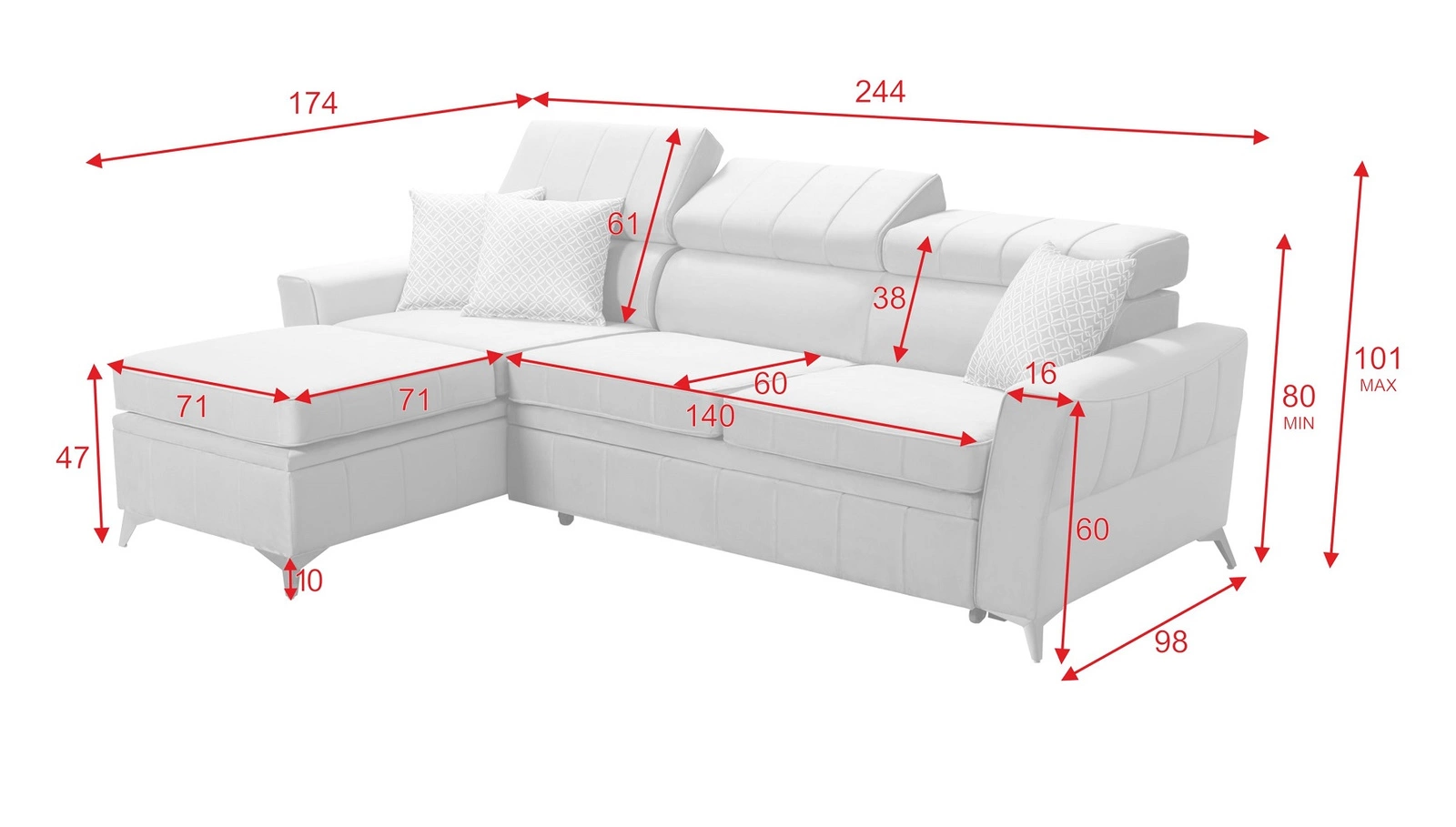 Die Abmessungen der Möbel sind optimal. Breite der Ecke 244 cm, maximale Höhe 101 cm und Tiefe 174 cm. Die Liegefläche des Eckschrankes beträgt 130x204 cm. Die Sitzhöhe des Möbels beträgt 47 cm und die maximale Höhe der Rückenlehne beträgt 61 cm. Gewellte Federn und T30-Polyurethanschaum ist das Material, aus dem der Sitz der Ecke hergestellt ist. Feste Rückenlehne mit verstellbaren Kopfstützen garantiert komfortable Entspannung nach einem langen Tag, die Sie, Ihre Lieben und auch Gäste, die auf diesem einzigartigen Ecksofa sitzen, zu schätzen wissen werden!
