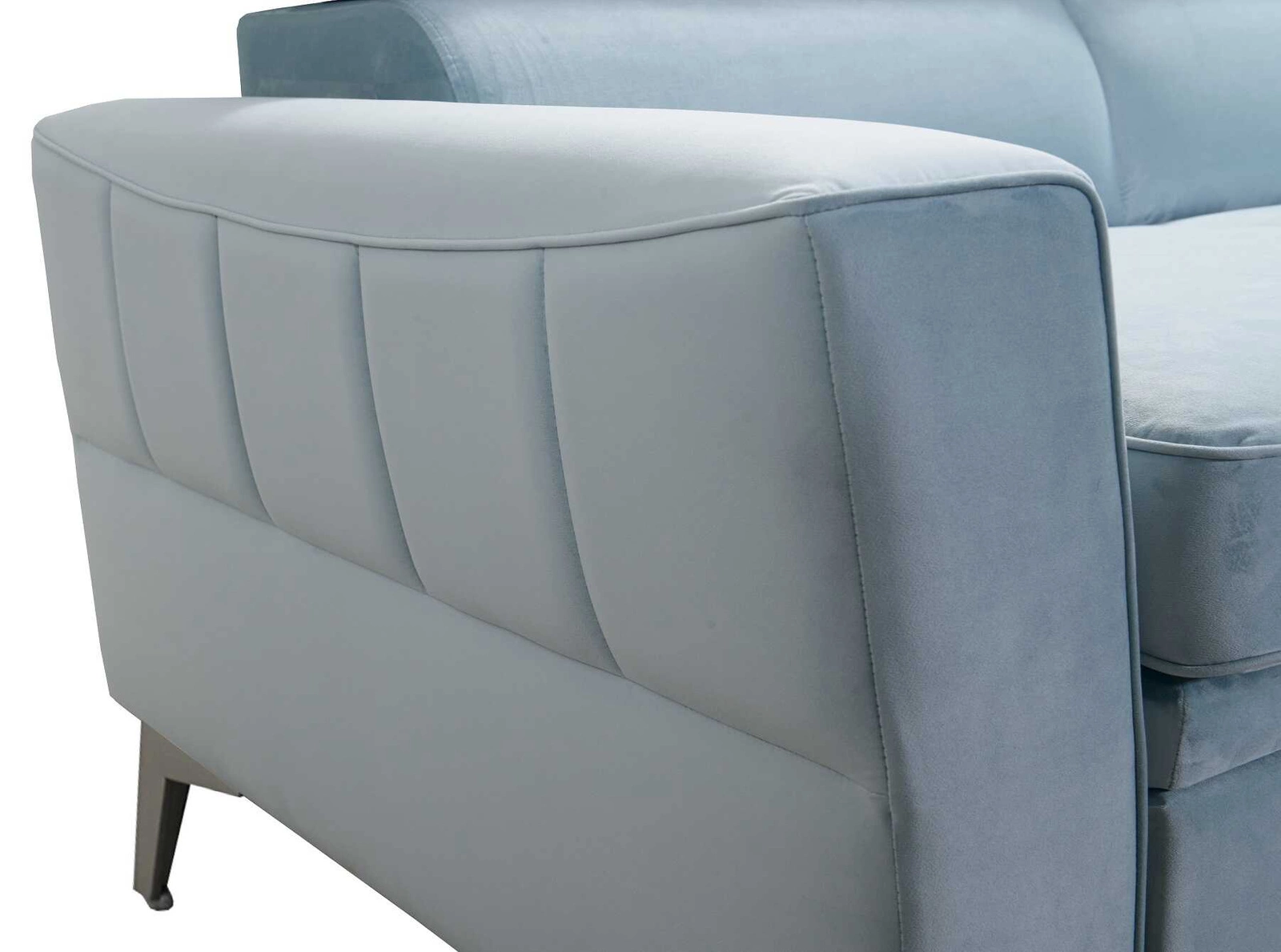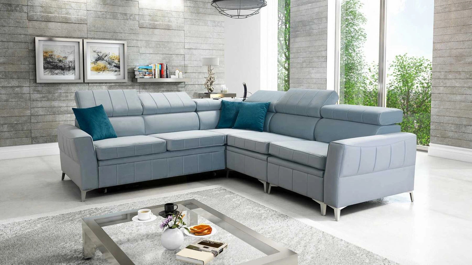 Ecksofa Rava IV in Blau mit verstellbaren Kopfstützen ist ein elegantes Möbelstück, das sich in jede Einrichtung einfügt.