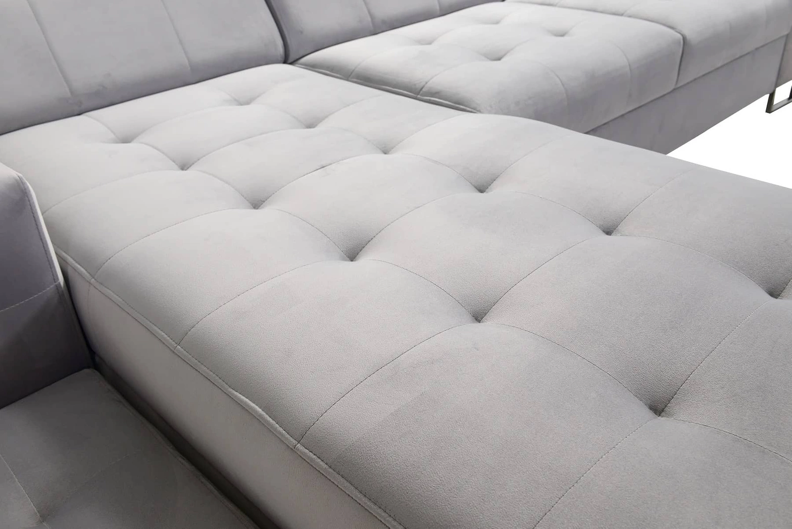- Das Ecksofa Hampton ist ein interessantes Möbelstück, das Komfort und Bequemlichkeit für den täglichen Gebrauch bietet. Dekorative Steppungen und Geradstiche verleihen dem Modell einen einzigartigen Charme. Ecksofa aus weichem Samtstoff.