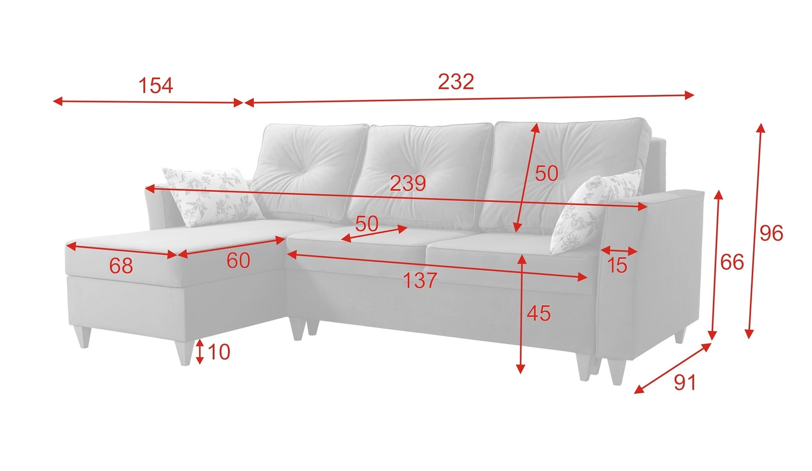 Die Abmessungen der Möbel sind optimal. Breite der Ecke 232 cm, höhe 96 cm und Tiefe 154 cm. Die Liegefläche des Eckschrankes beträgt 132x205 cm. Die Sitzhöhe des Möbels beträgt 45 cm und die maximale Höhe der Rückenlehne beträgt 50 cm. Gewellte Federn und T30-Polyurethanschaum ist das Material, aus dem der Sitz der Ecke hergestellt ist. Rückenlehne kissen garantiert komfortable Entspannung nach einem langen Tag, die Sie und Ihre Gäste auf diesem einzigartigen Ecksofa schätzen werden.