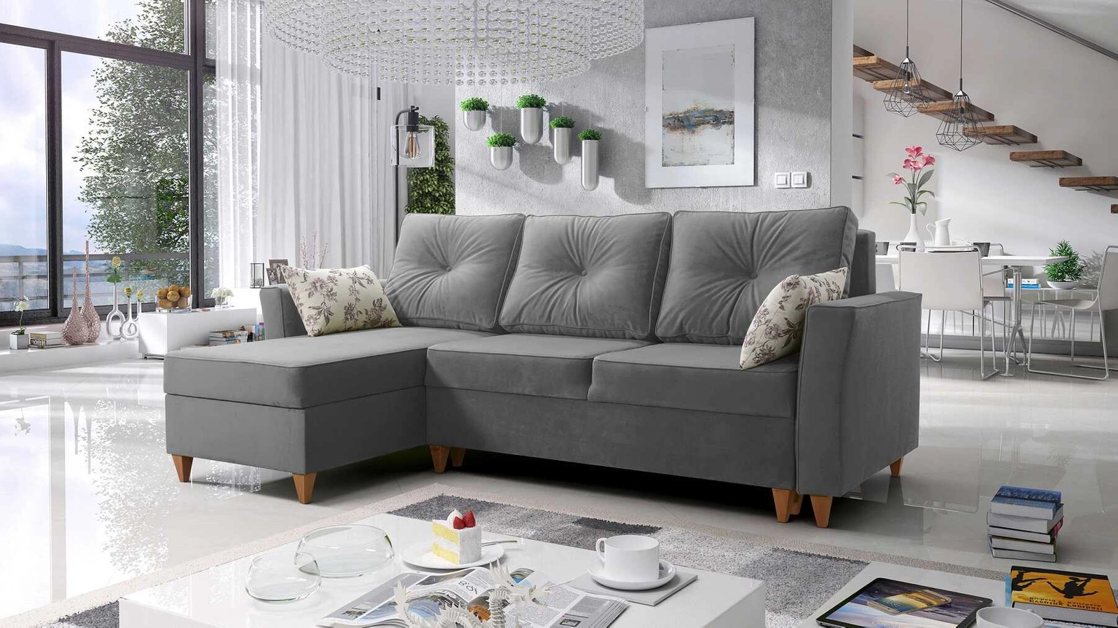 Ecksofa mit Schlaffunktion Topeka graue Esche linke Seite stilvolles und modernes Design, das sich in jede Einrichtung einfügt