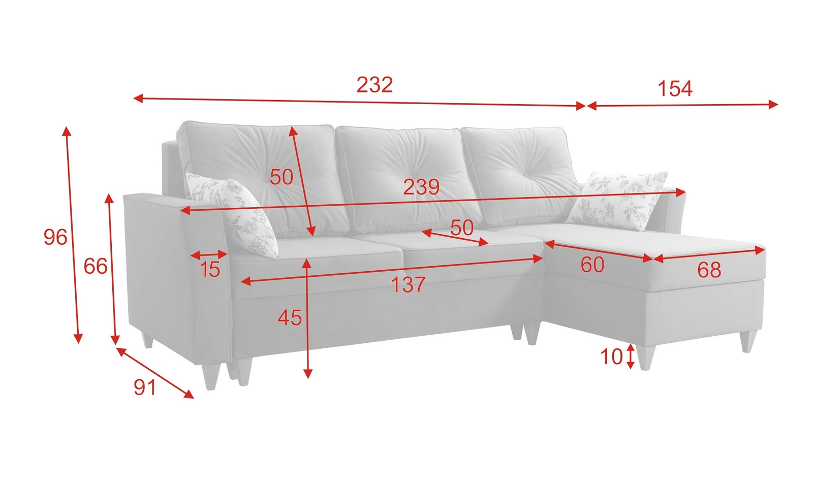 Die Abmessungen der Möbel sind optimal. Breite der Ecke 232 cm, höhe 96 cm und Tiefe 154 cm. Die Liegefläche des Eckschrankes beträgt 132x205 cm. Die Sitzhöhe des Möbels beträgt 45 cm und die maximale Höhe der Rückenlehne beträgt 50 cm. Gewellte Federn und T30-Polyurethanschaum ist das Material, aus dem der Sitz der Ecke hergestellt ist. Rückenlehne kissen garantiert komfortable Entspannung nach einem langen Tag, die Sie und Ihre Gäste auf diesem einzigartigen Ecksofa schätzen werden.
