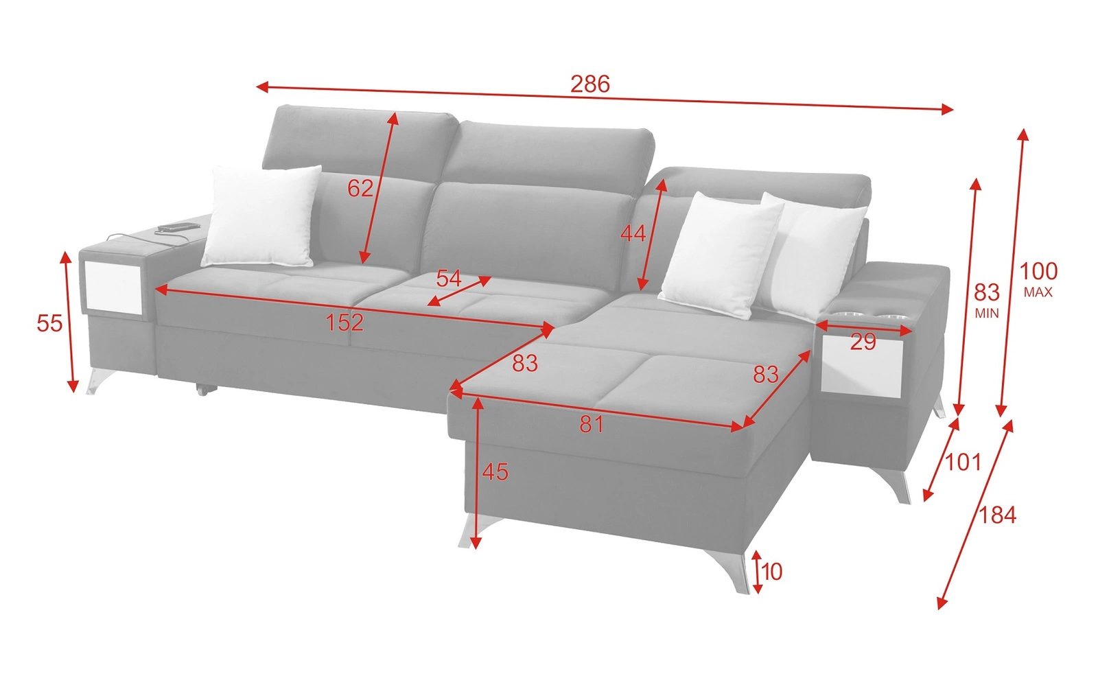 Die Abmessungen der Möbel sind optimal. Breite der Ecke 286 cm, maximale Höhe 100 cm und Tiefe 184 cm. Die Liegefläche der Eckeinheit beträgt 122x230 cm. Die Sitzhöhe des Möbels beträgt 45 cm und die maximale Höhe der Rückenlehne beträgt 62 cm. Gewellte Federn und T30-Polyurethanschaum ist das Material, aus dem der Sitz der Ecke hergestellt ist. Feste Rückenlehne mit verstellbaren Kopfstützen garantiert komfortable Entspannung nach einem langen Tag, die Sie, Ihre Lieben und auch Gäste, die auf diesem einzigartigen Ecksofa sitzen, zu schätzen wissen werden!