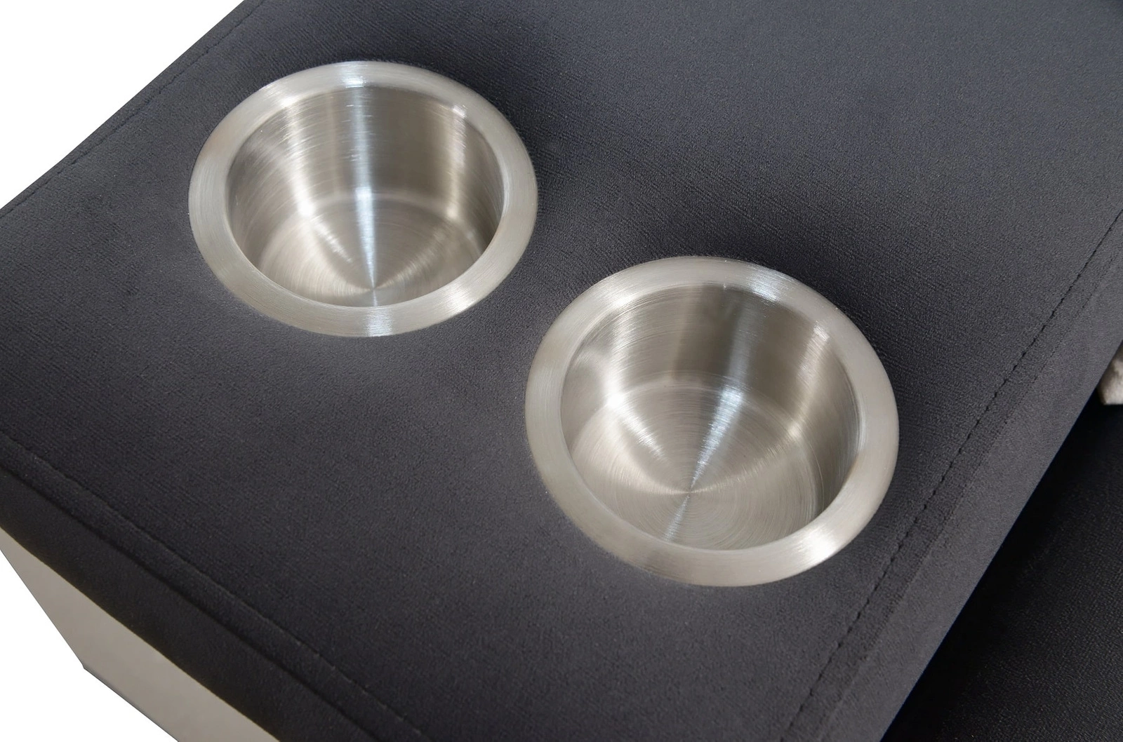 • zwei Schubladen und zwei stahlfarbene Getränkehalter an der Seite