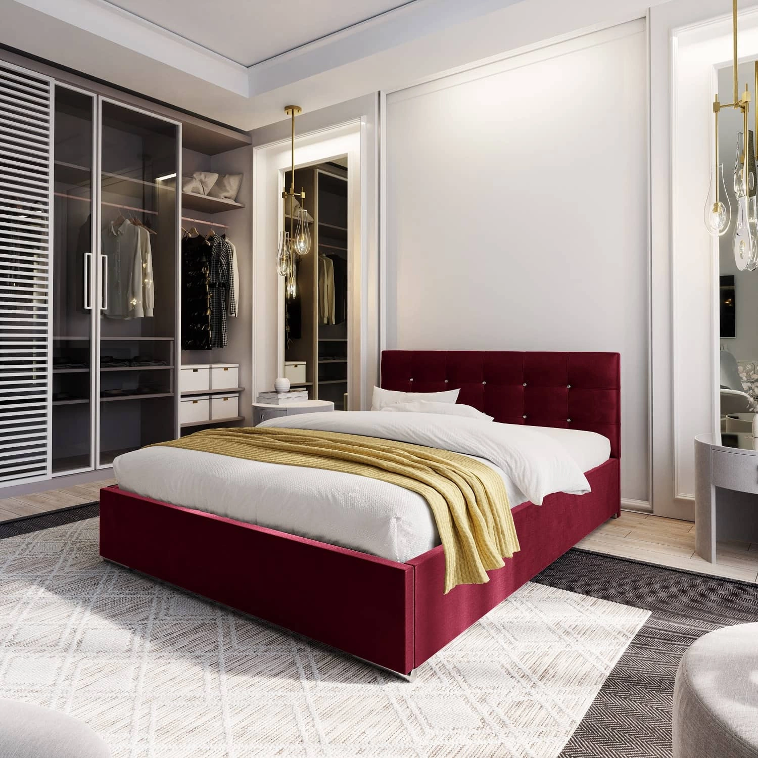 Das Polsterbett Mona 160x200 in burgunderrot ist eine ideale Lösung für modern, skandinavisch und klassisch eingerichtete Schlafzimmer.