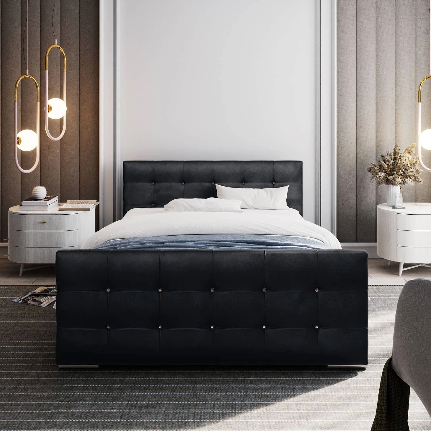 • Das Alford-Polsterbett ist die ideale Lösung für modern, skandinavisch und klassisch eingerichtete Schlafzimmer. Die Konstruktion des Bettes gewährleistet eine hohe Stabilität und einen hohen Nutzungskomfort. Gestepptes Kopf- und Fußteil mit Kristallen is