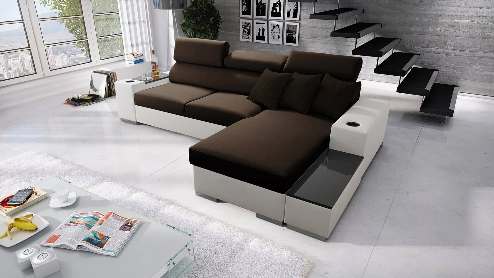 Ecksofa Provo in Braun/Weiß mit verstellbaren Kopfstützen ist ein elegantes Möbelstück, das sich in jede Einrichtung einfügt.