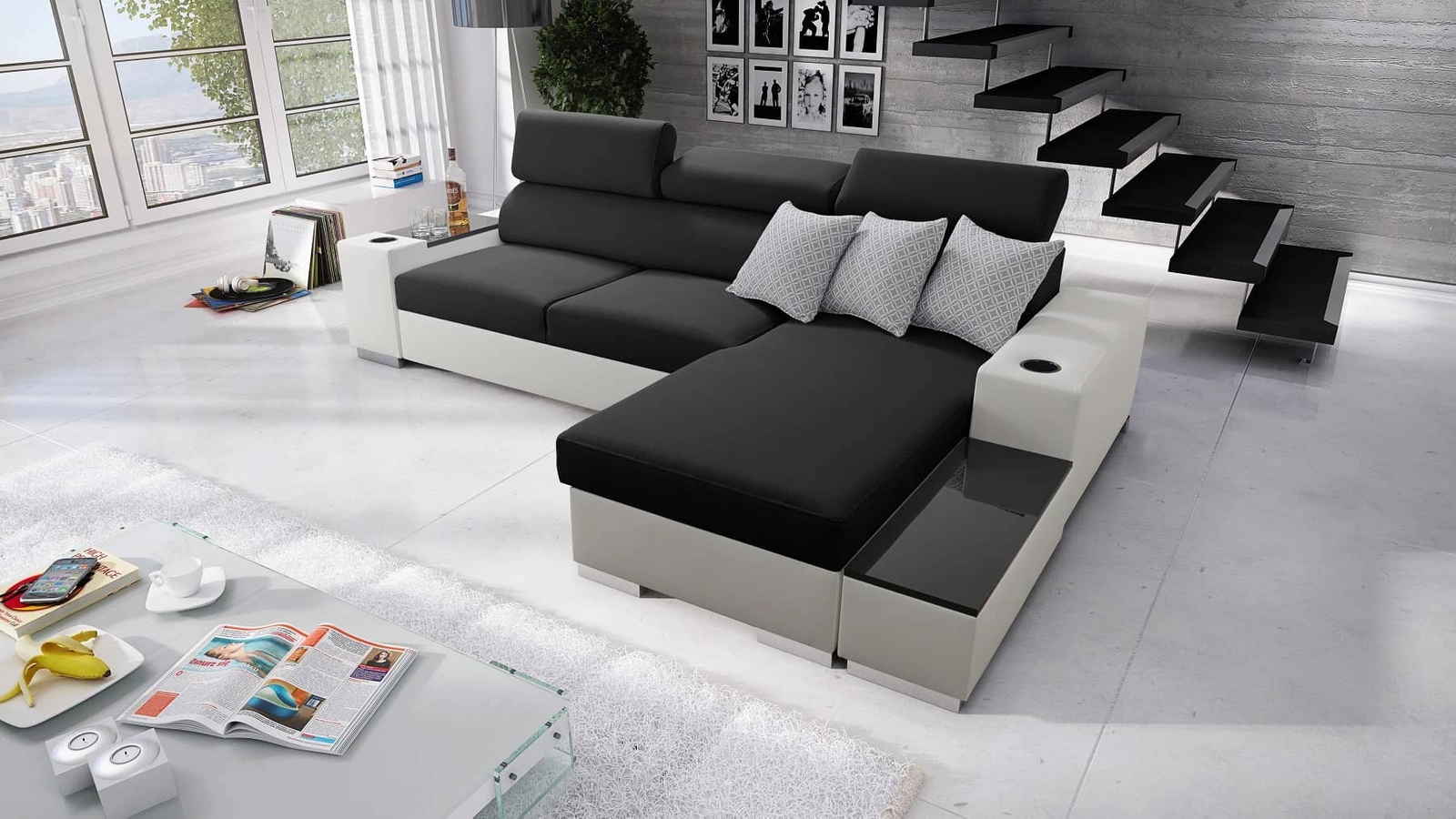 Ecksofa Provo in Schwarz/Weiß mit verstellbaren Kopfstützen ist ein elegantes Möbelstück, das sich in jede Einrichtung einfügt.