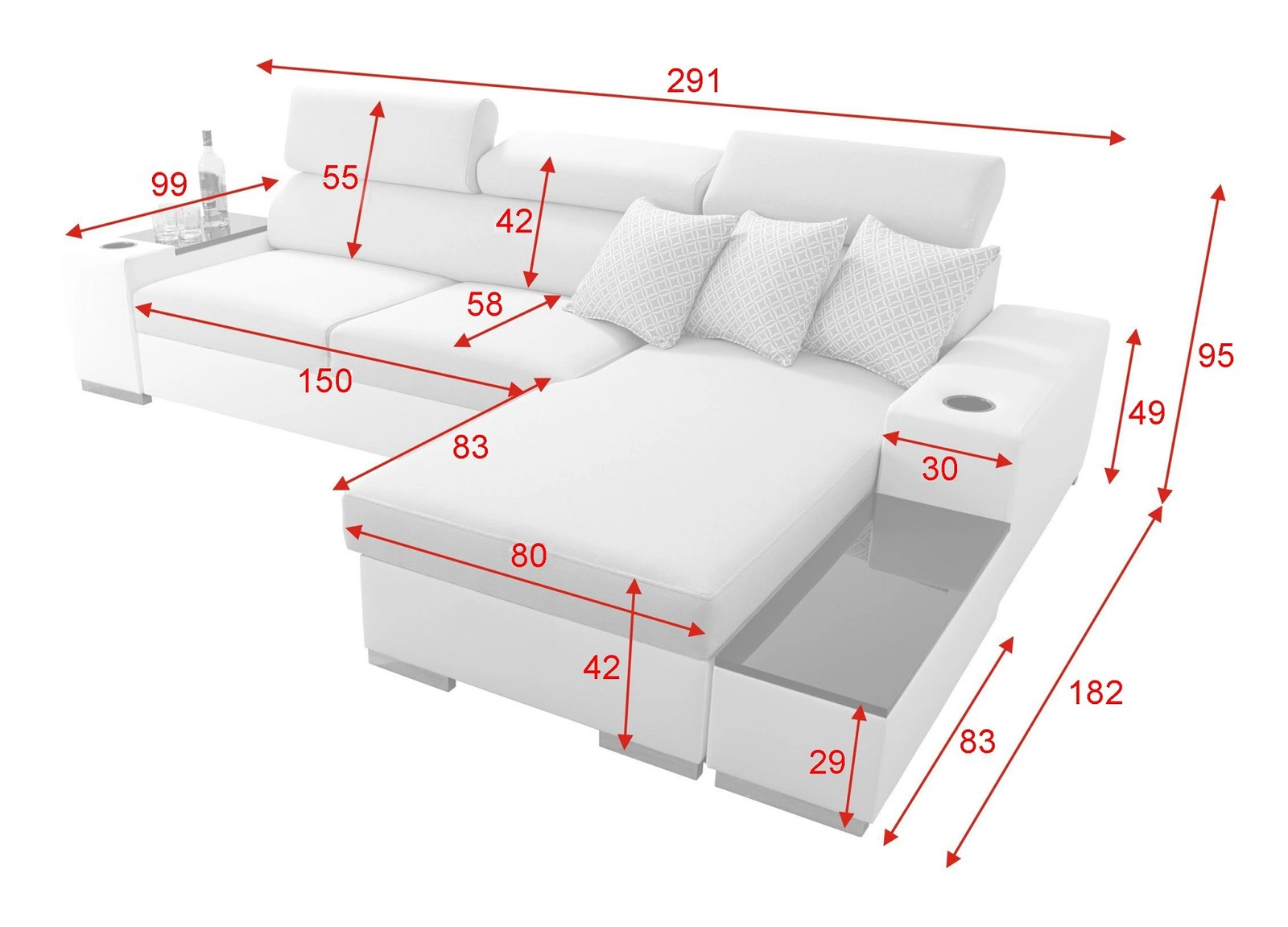 Die Abmessungen der Möbel sind optimal. Breite der Ecke 291 cm, maximale Höhe 95 cm und Tiefe 182 cm. Die Liegefläche der Eckeinheit beträgt 127x226 cm. Die Sitzhöhe des Möbels beträgt 42 cm und die maximale Höhe der Rückenlehne beträgt 55 cm. Gewellte Federn und T30-Polyurethanschaum ist das Material, aus dem der Sitz der Ecke hergestellt ist. Feste Rückenlehne mit verstellbaren Kopfstützen garantiert komfortable Entspannung nach einem langen Tag, die Sie, Ihre Lieben und auch Gäste, die auf diesem einzigartigen Ecksofa sitzen, zu schätzen wissen werden!