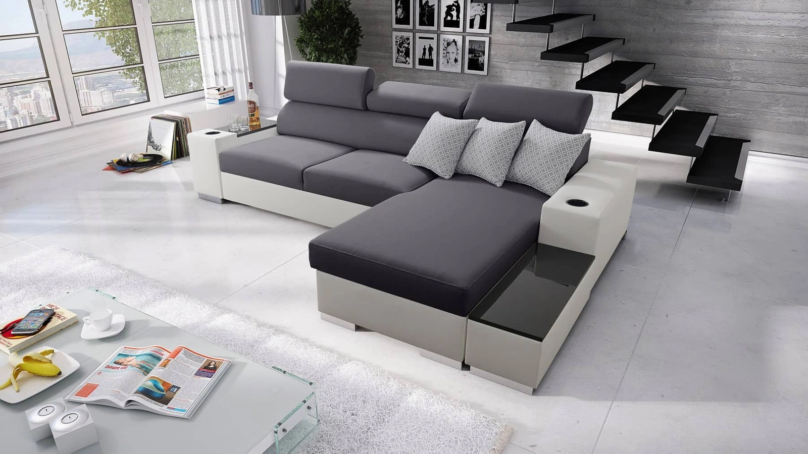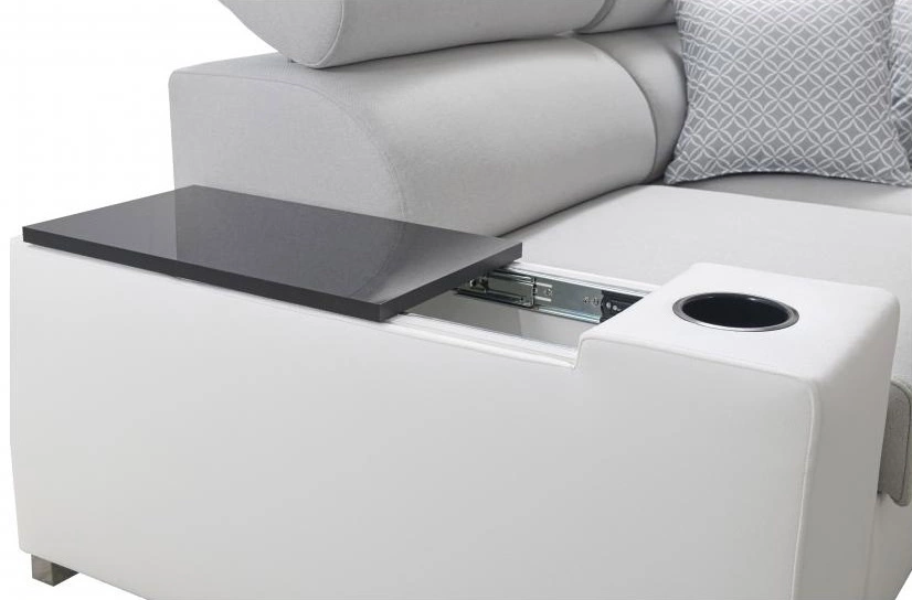 Ecksofa Provo in Graphit/Weiß mit verstellbaren Kopfstützen ist ein elegantes Möbelstück, das zu jeder Einrichtung passt.