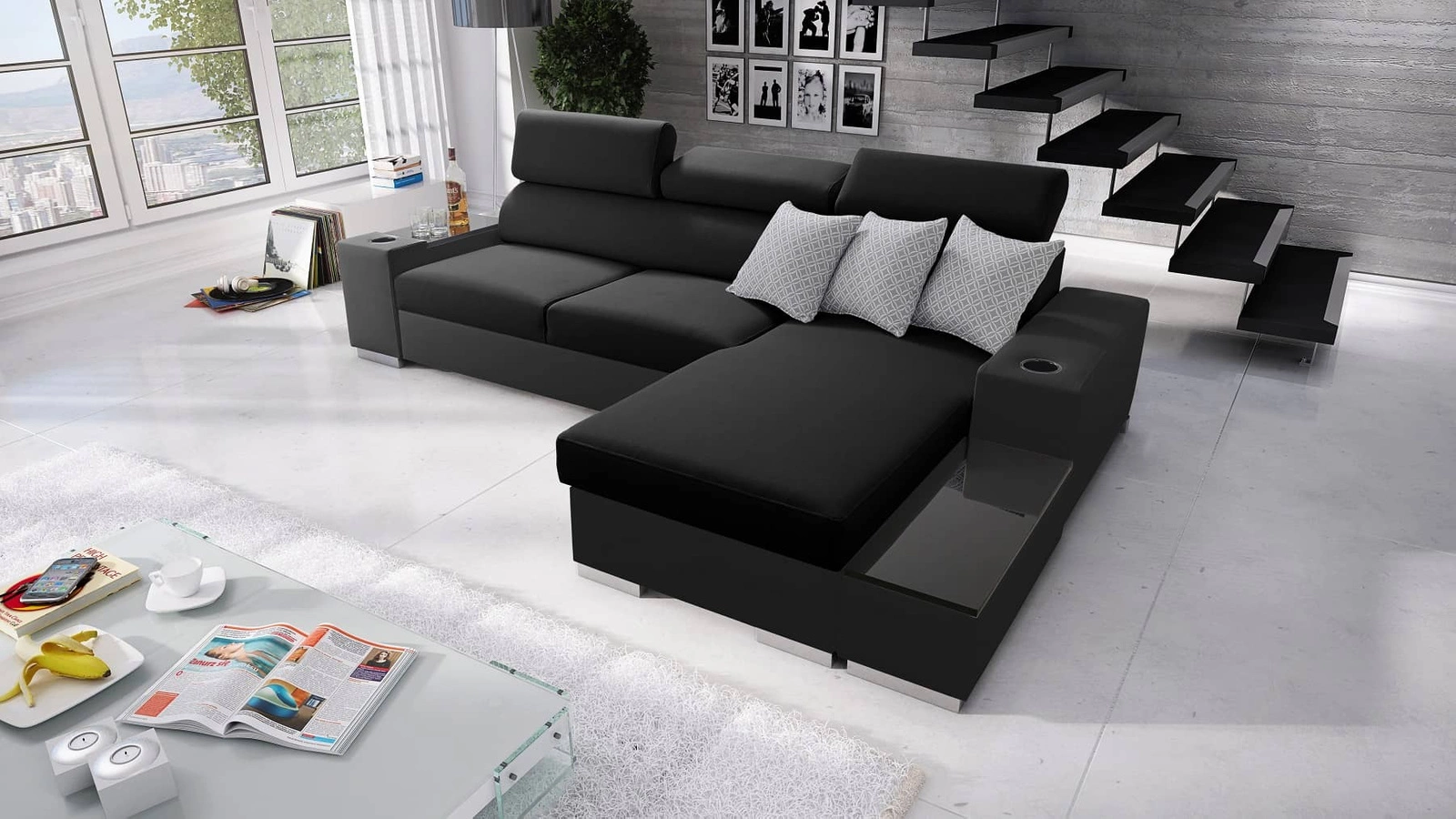 Ecksofa Provo in Schwarz mit verstellbaren Kopfstützen ist ein elegantes Möbelstück, das sich in jede Einrichtung einfügt.
