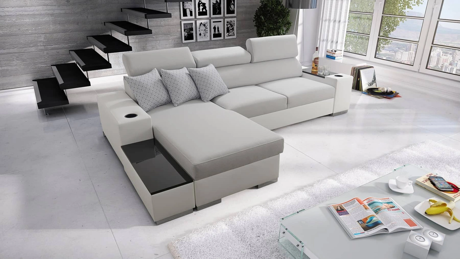 Die Gewebeeigenschaften umfassen hydrophobie verhinderung der Absorption von Flüssigkeiten und hohe Widerstandsfähigkeit gegen Abrieb und Ausfransen. Der Stoff ist außerdem schwer entflammbar und leicht sauber zu halten. Weich, glatt der Luxo-Bezugsstoff zeichnet sich durch seine leicht wahrnehmbare Struktur aus. Ekj-Leder zeichnet sich außerdem durch hohe Widerstandsfähigkeit gegen Ausbleichen. Der Eckschrank ist aus hochwertigen Materialien gefertigt, die resistent gegen äußere Einflüsse wie Möbelbezüge und verschiedene Arten von Stößen sind. Mobile Erweiterung ist eine tolle Lösung für einen zusätzlichen Couchtisch für das Wohnzimmer. Eine weitere funktionale Ergänzung ist die öffnungsleiste in der Ecke Seite.