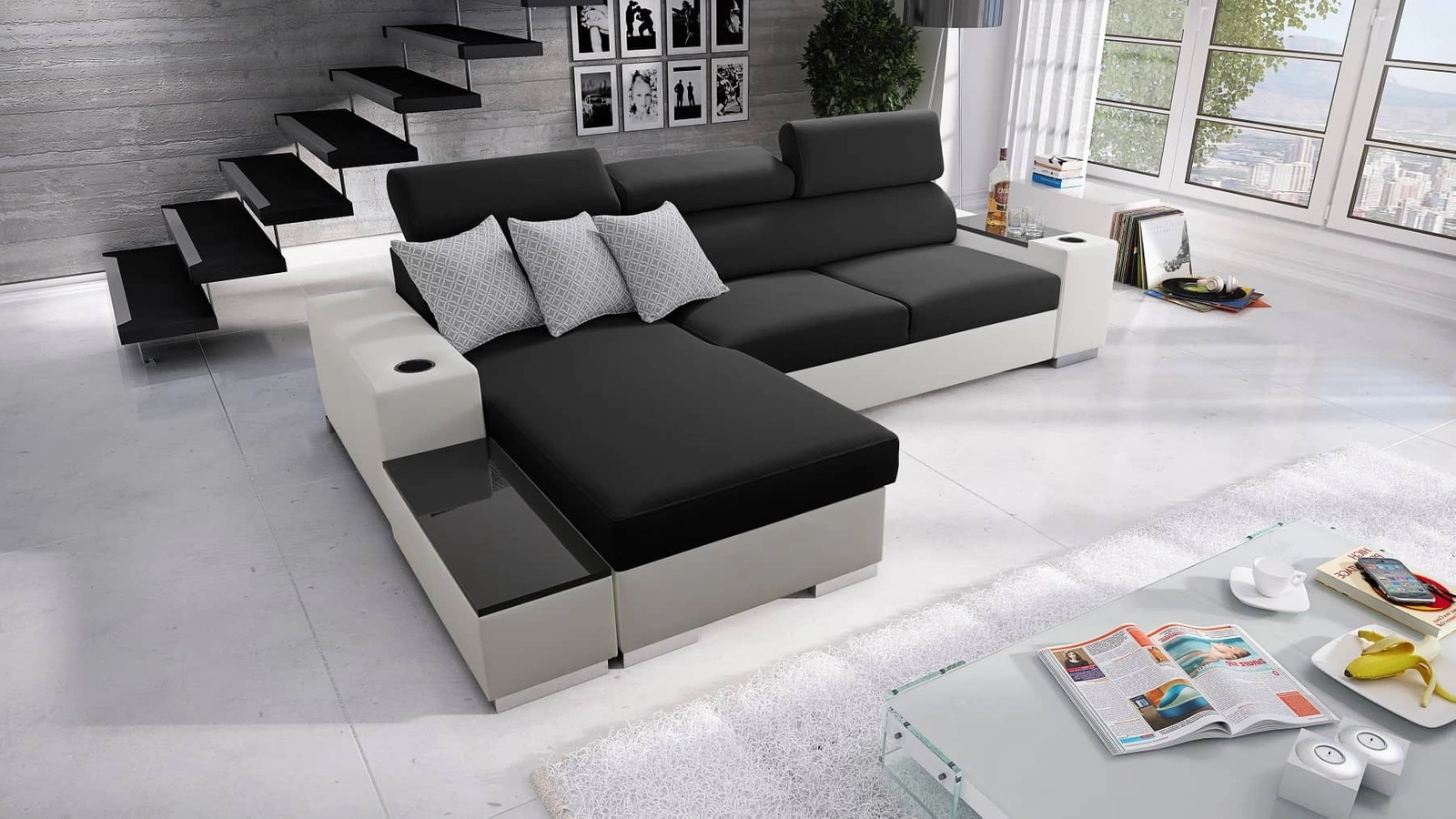 Ecksofa Provo in Schwarz/Weiß mit verstellbaren Kopfstützen ist ein elegantes Möbelstück, das sich in jede Einrichtung einfügt.