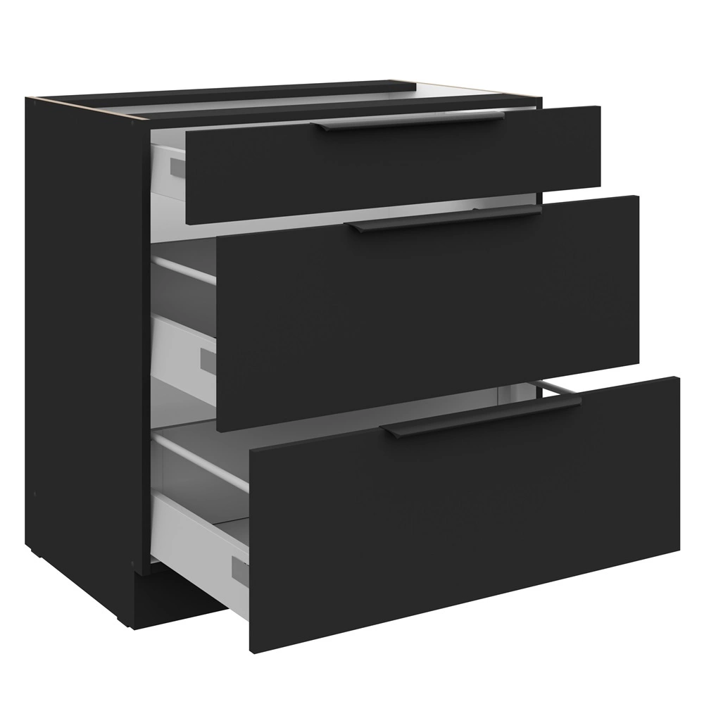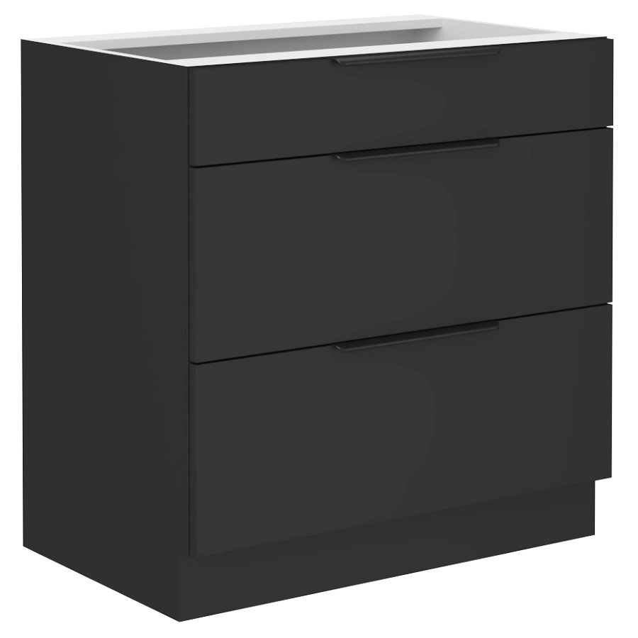 Der freistehende Küchenschrank mit Schubladen Black 80 D-3S-BB ist ein elegantes und modernes Element der Küchenausstattung, das sich durch sein einfaches, minimalistisches Design auszeichnet. Hergestellt aus hochwertigen Materialien, ist er beständig gegen Feuchtigkeit und mechanische Beschädigungen, was seine Langlebigkeit und Robustheit gewährleistet. Der Schrank verfügt über drei geräumige Schubladen, die eine bequeme Aufbewahrung verschiedener Küchenutensilien ermöglichen und für Ordnung und Organisation sorgen. Seine matten schwarzen Fronten in Kombination mit den metallischen Kanten-Griffen verleihen dem Raum ein modernes und elegantes Aussehen, das sich perfekt mit anderen Küchenelementen ergänzt.