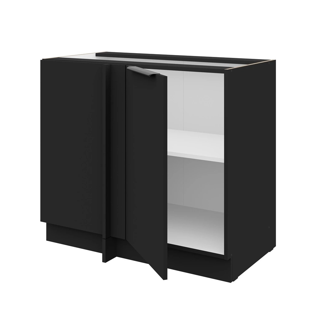 Eck-Küchenschrank-Türen in Schwarz mit matter Oberfläche sind aus laminierter Platte hergestellt. Die Vorderseite ist sehr widerstandsfähig gegen Feuchtigkeit und Unfallschäden. Eine stilvolle Ergänzung zu den Küchenschrankfronten sind schwarz, metallkantenhalterungen, die zusätzlich zu ihrer Hauptfunktion eine besondere Note in die.