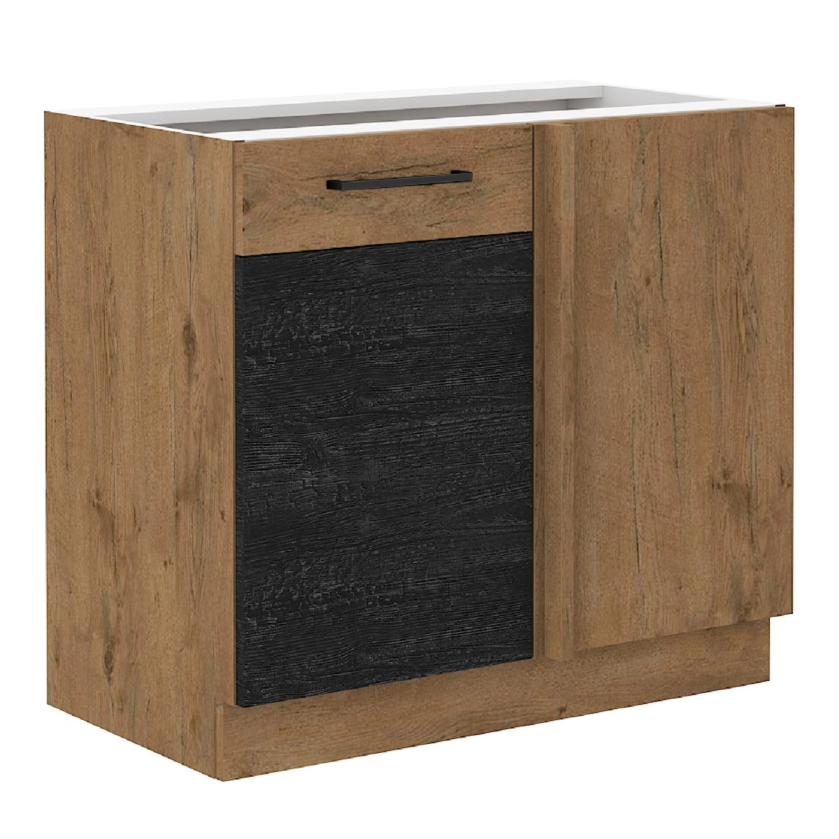 Der Vanimo-Eckschrank in dunklem Holz / Eiche lancelot gehört zur Kategorie der modularen Küchenmöbel, aus denen sich jedes gewünschte Set zusammenstellen lässt.