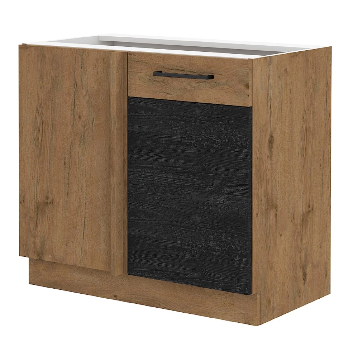 Der Vanimo-Eckschrank in dunklem Holz / Eiche lancelot gehört zur Kategorie der modularen Küchenmöbel, aus denen sich jedes gewünschte Set zusammenstellen lässt.