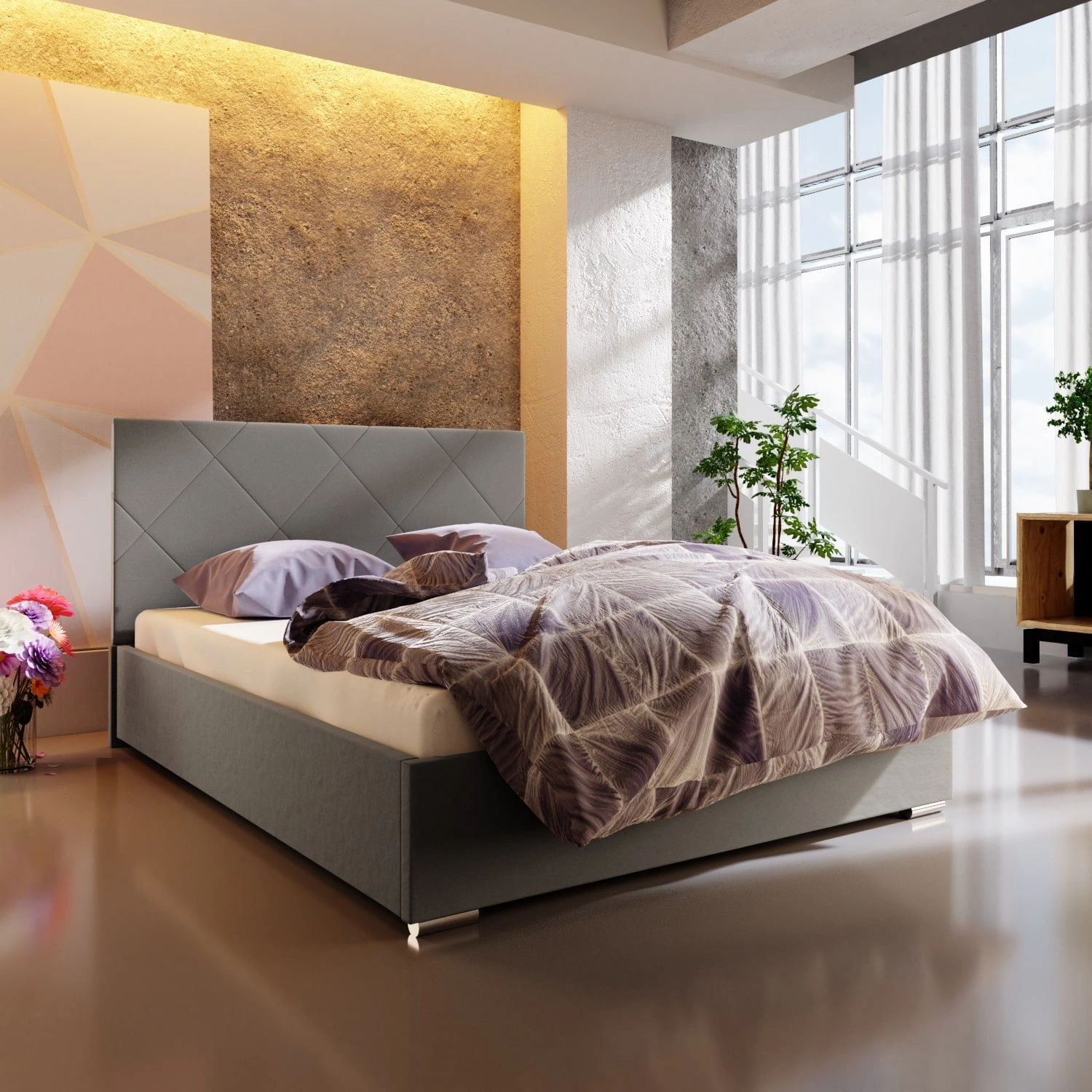 Hernani gepolstertes Bett 180x200 grau mit modernem Kopfteil ideal für Schlafzimmer