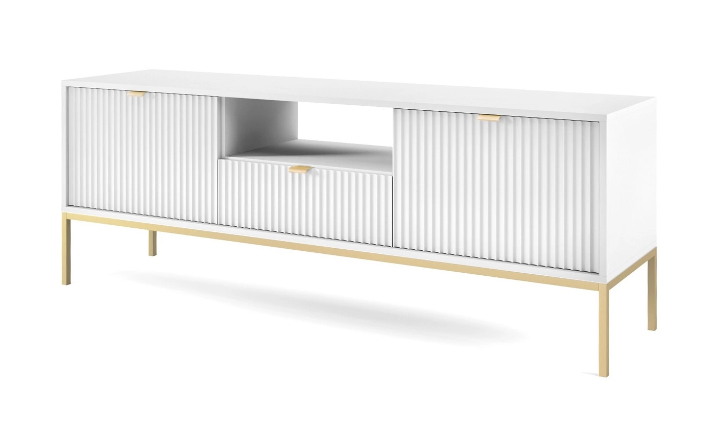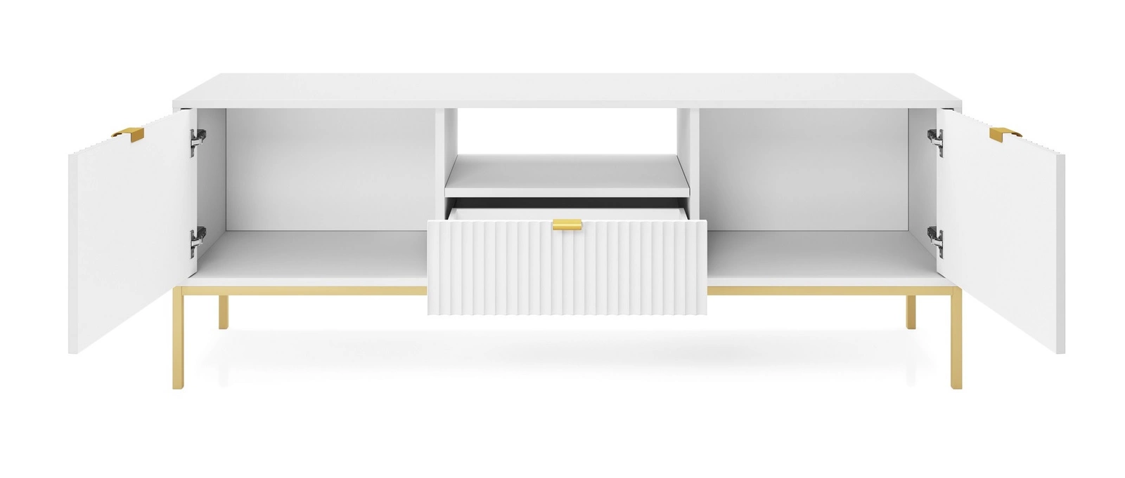 TV Schrank Lovro 154 cm weiß modernes Design wird Liebhaber von ausdrucksstarken Interieurs begeistern goldene Metall-Accessoires