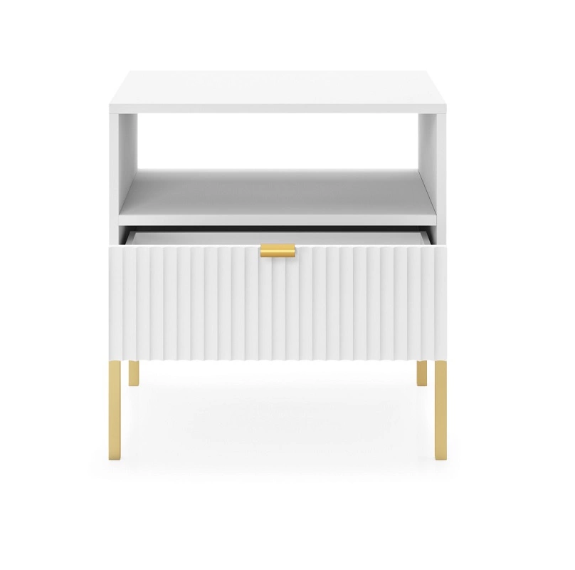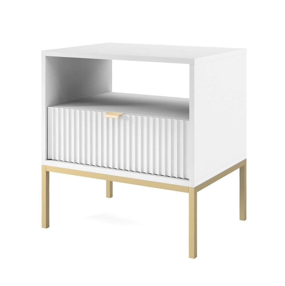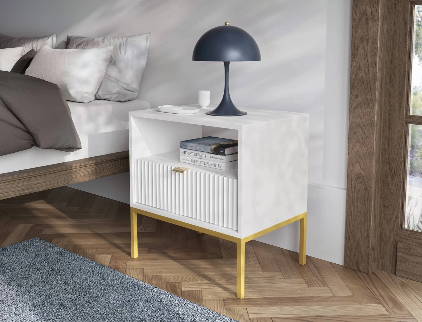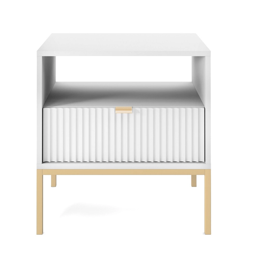 Lovro Nachttisch mit Schublade weiß geschmackvoll geriffelt Dekor ideal Schlafzimmer Schrank Gold Metall Zubehör
